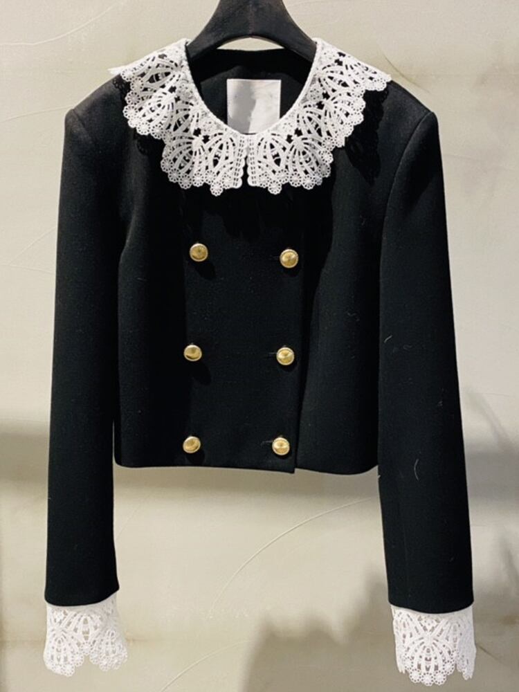 [EWQ] ラプル O ネックフックフラワースプライスショートジャケットダブルブレストパッチワークジャケットコート春秋トップ スプリング 春物 オータム 秋物 Oネック フラワーデザイン