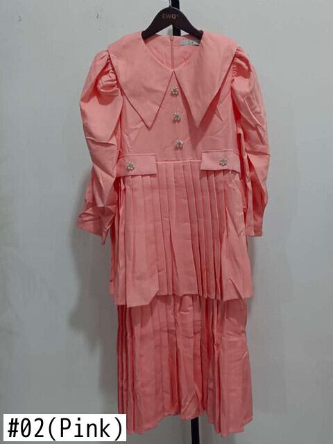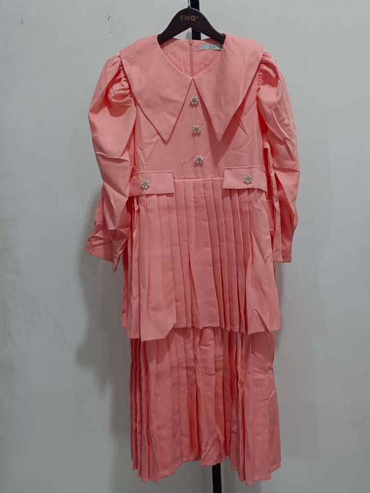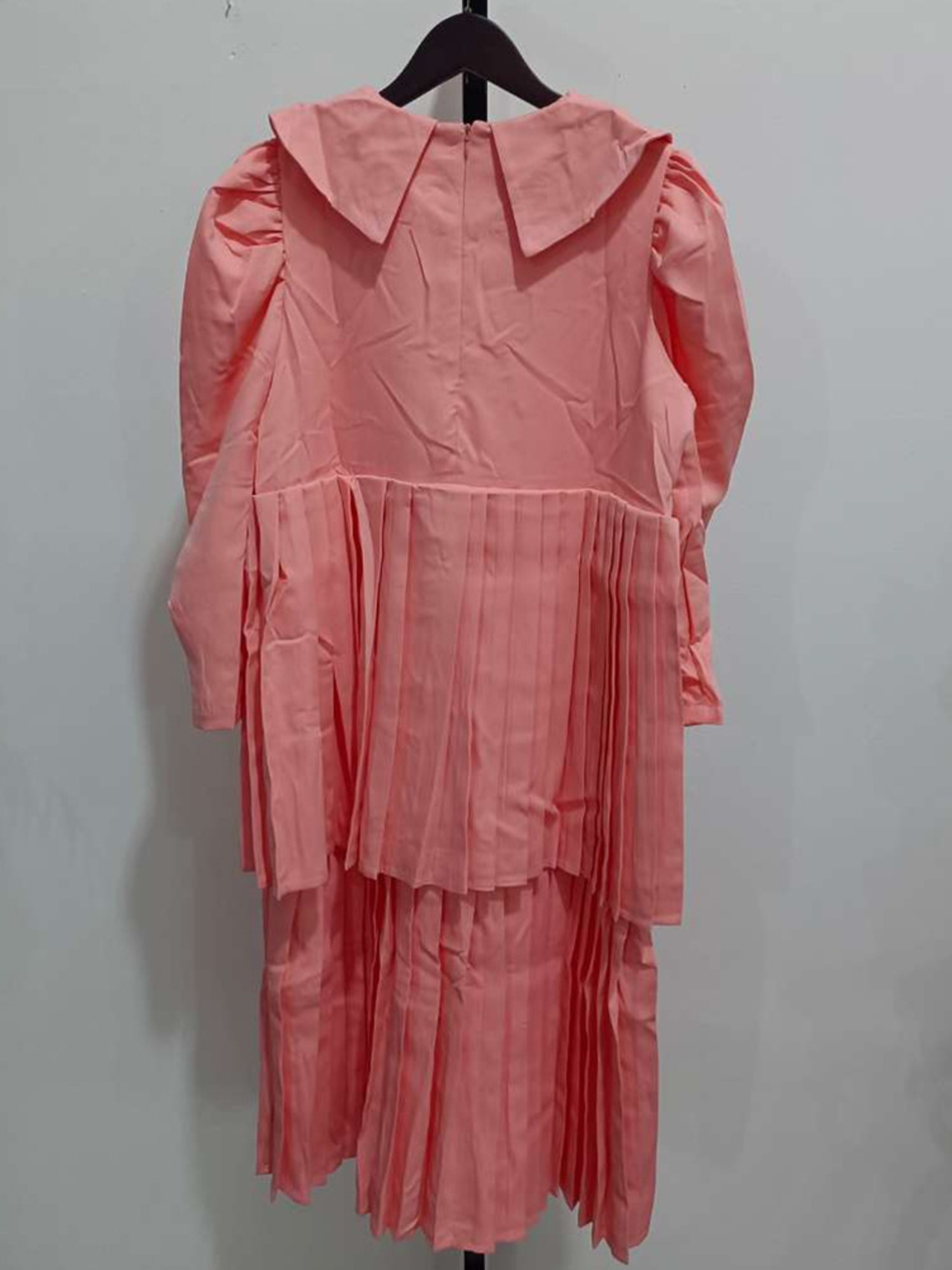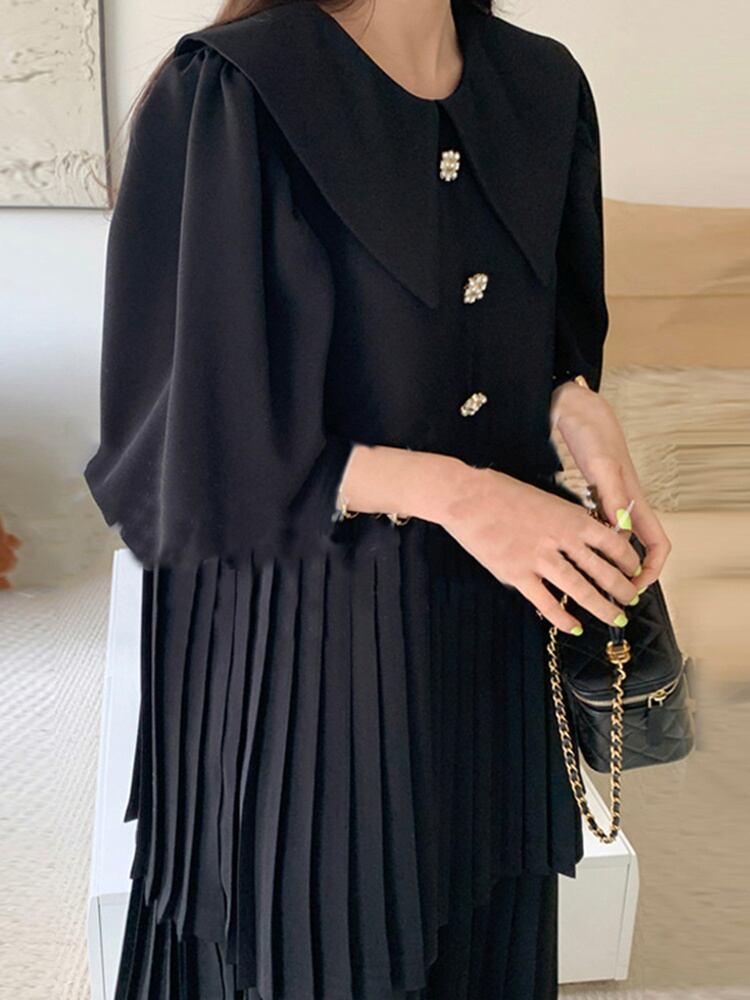 [EWQ] 甘いかわいいプリーツピーターパンカラードレスパフスリーブパールボタン装飾夏 Vestidos 大人ガーリー スウィート キュート カジュアル サマー 夏物 真珠