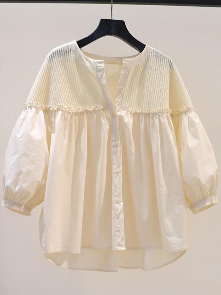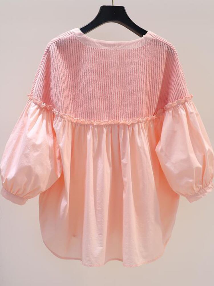 [EWQ] ニットスプライシングルーズシャツサマータイドピンクランタンスリーブプリーツパッチワークトップス 16Y9416 夏物