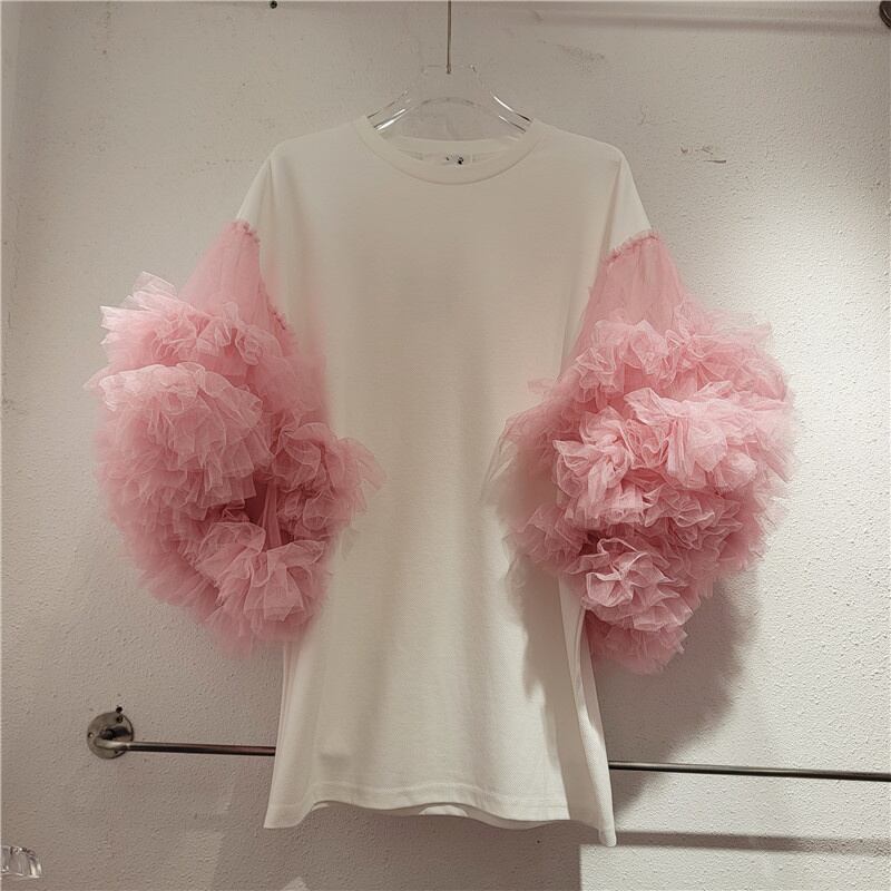[EWQ] Tシャツパッチワークメッシュピンクフリル半袖コントラストカラー Tシャツトップ夏潮ルーズフィット Tシャツ 6U211 ショート ハーフスリーブ サマー 夏物