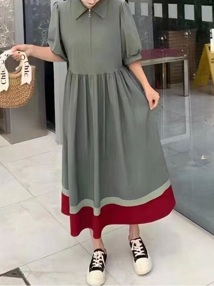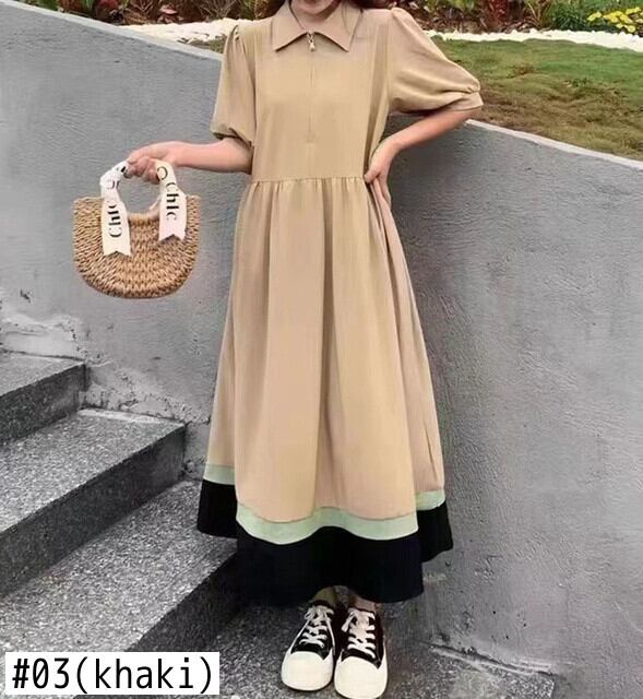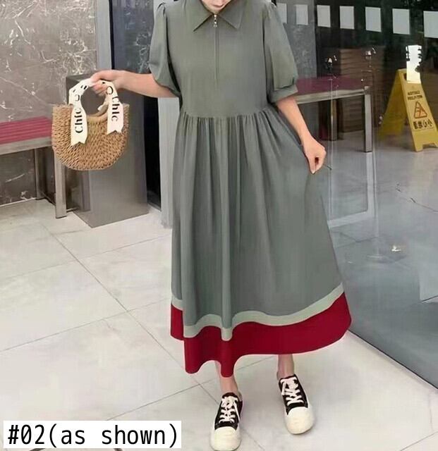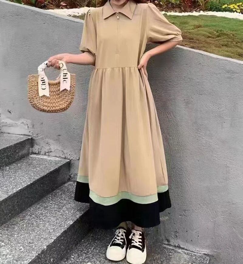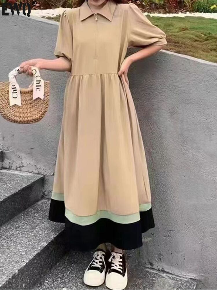 [EWQ] パッチワークプリーツウエストドレスラペル因果パフスリーブドレス夏潮 Vestido サマー 夏物