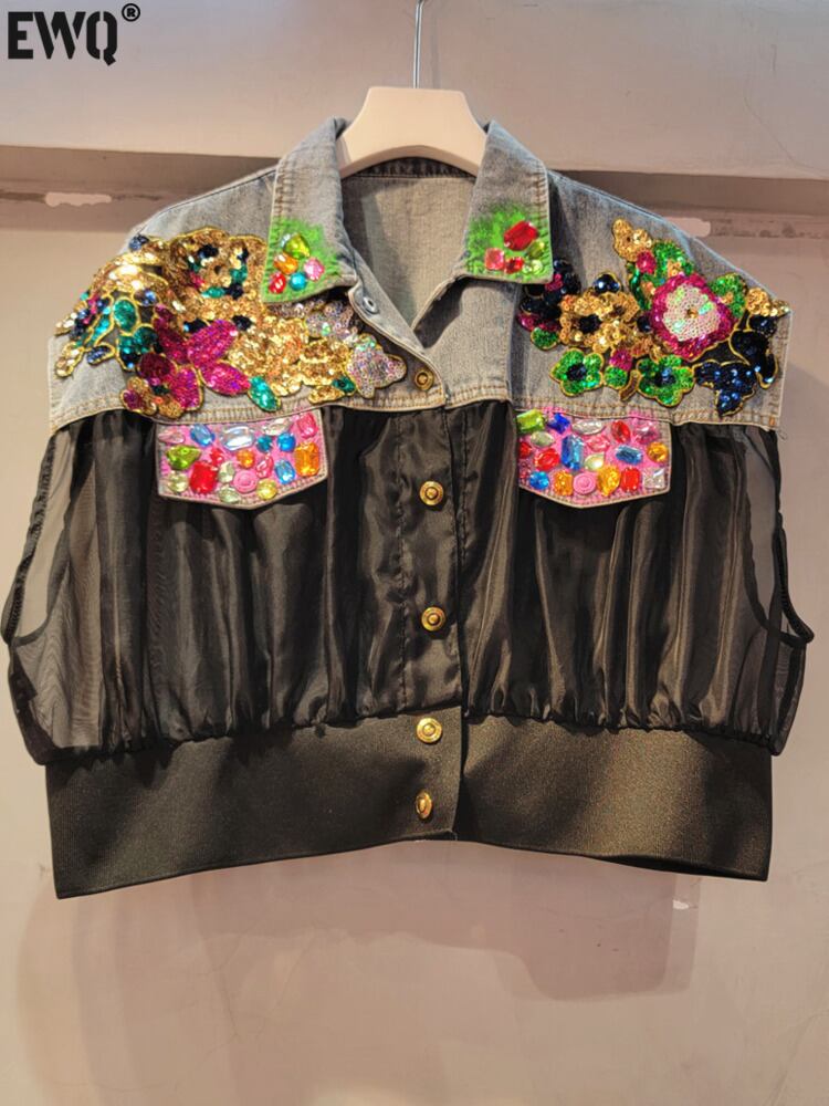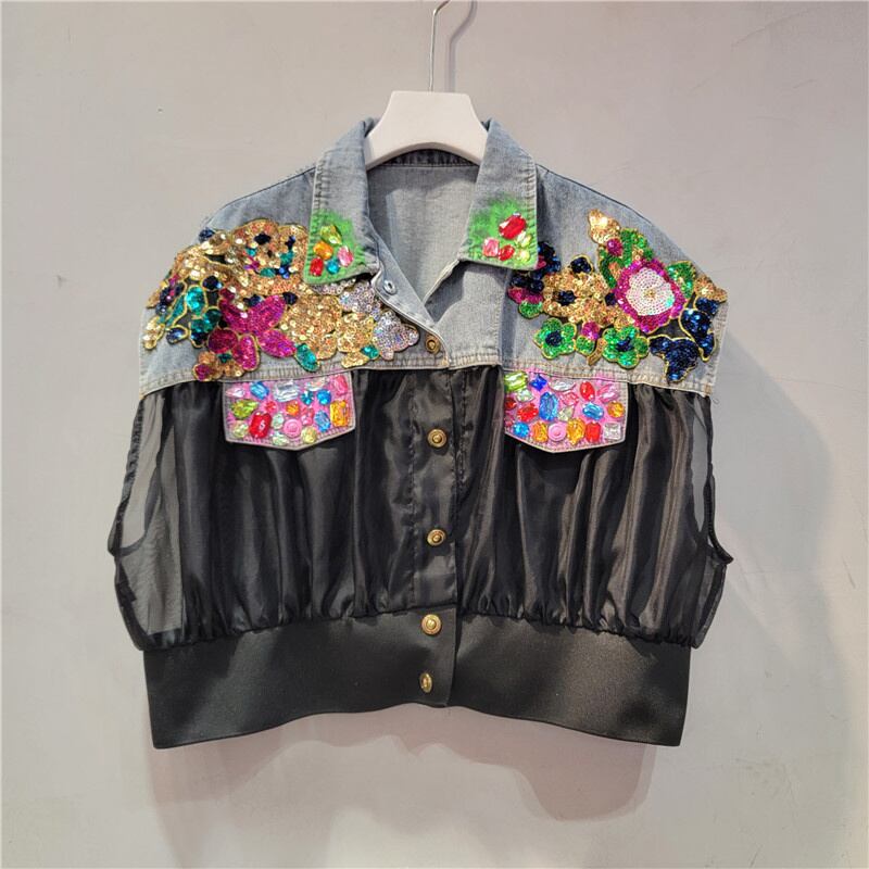[EWQ] ダイヤモンド パッチワーク オーガンザ ベスト レディース コントラスト シングルブレスト ノースリーブ ジャケット ストリート 夏 16U197 サマー 夏物