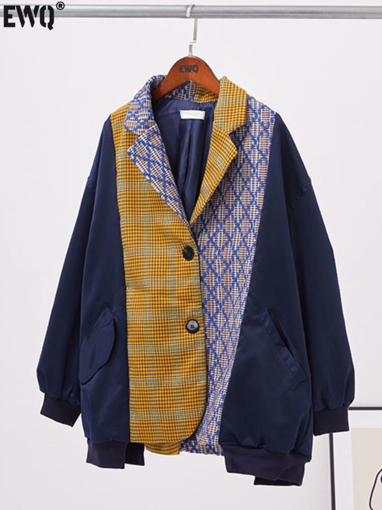 [EWQ] ルーズカラーコントラストパッチワークブレザーコートシングルブレストスーツジャケット長袖コート夏潮 ロング サマー 夏物