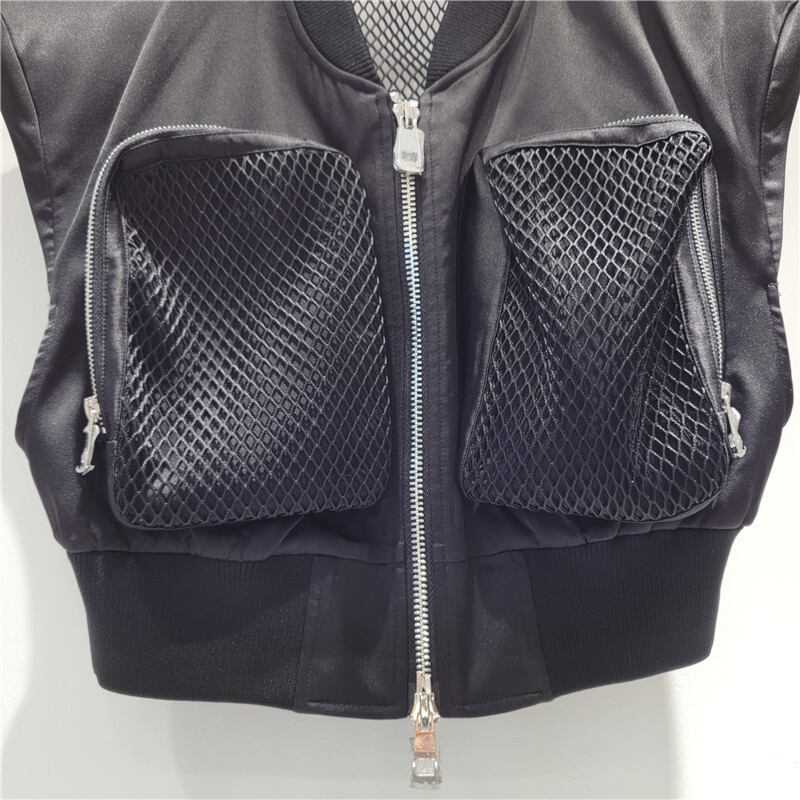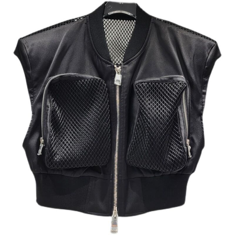 [EWQ] ストリートポケットメッシュスプライスショルダーパッドベスト黒ノースリーブジャケット夏潮生き抜くトップス ブラック サマー 夏物