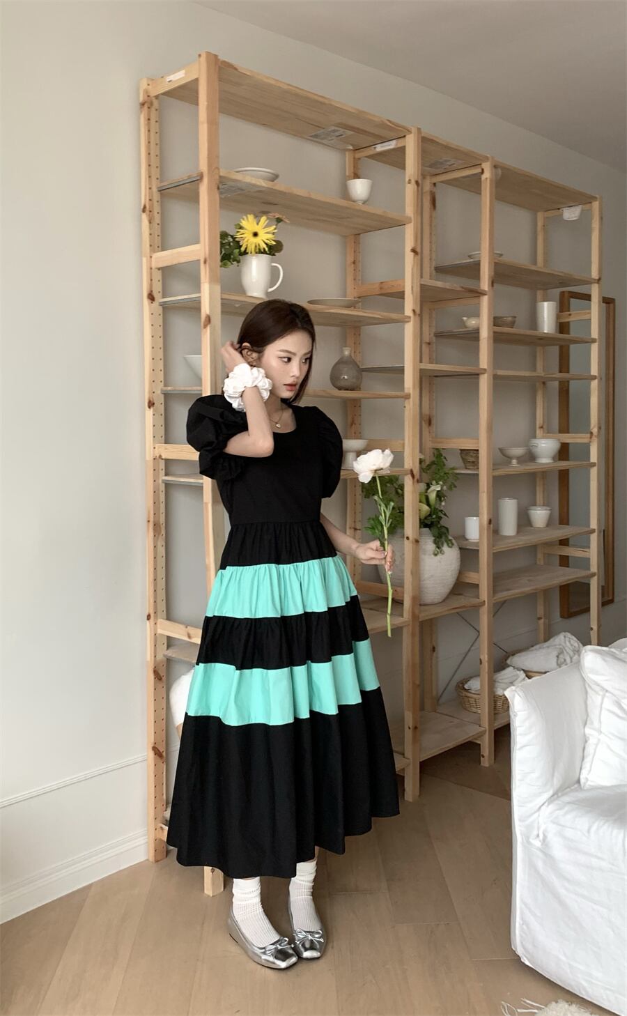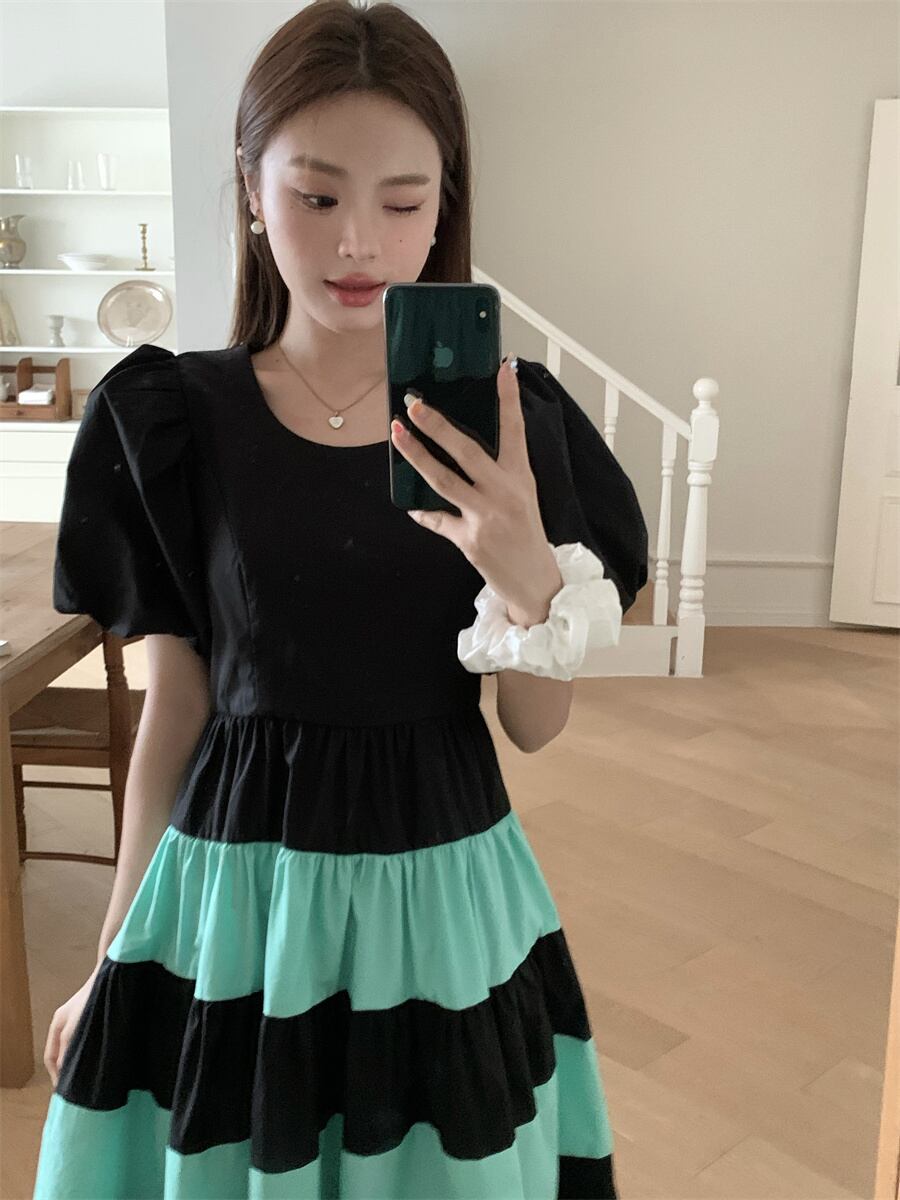 [EWQ] ストライプコントラストパッチワークパフスリーブドレス O ネックプリーツスリムドレス夏潮 Vestidos サマー 夏物 Oネック