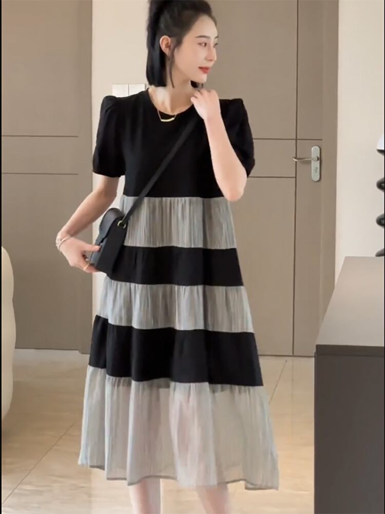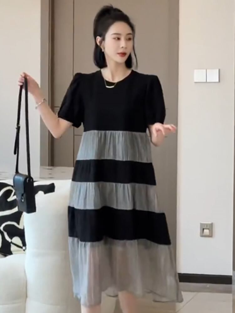 [EWQ] 裾視点パッチワークドレス夏コントラストルーズ半袖 T シャツドレス Vestido ショート ハーフスリーブ サマー 夏物 Tシャツ