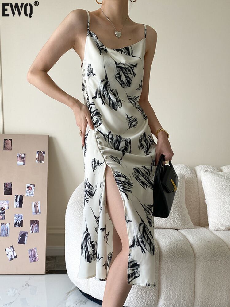 [EWQ] プリントボタンスプリットスリングドレスコントラストカラーノースリーブドレスサマータイド Vestido 夏物