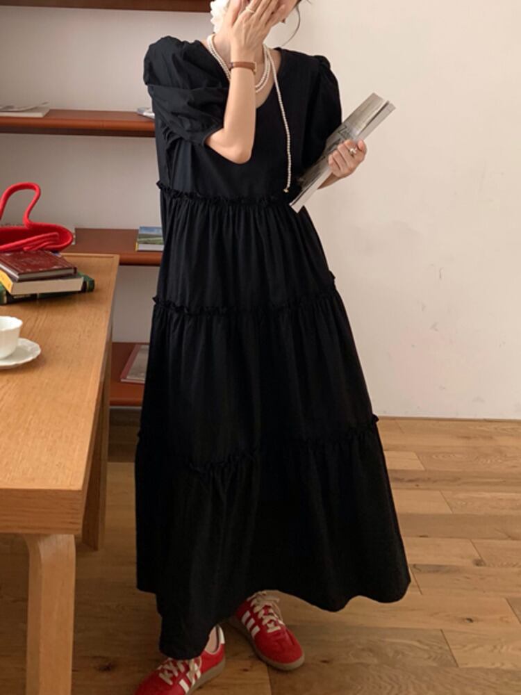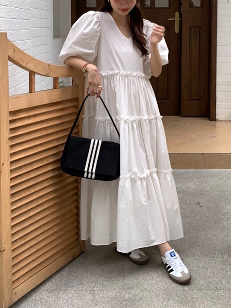 [EWQ] V ネックドレスピンクフリルパッチワークパフスリーブルーズフィットドレス夏潮 Vestido 298 サマー 夏物 Vネック