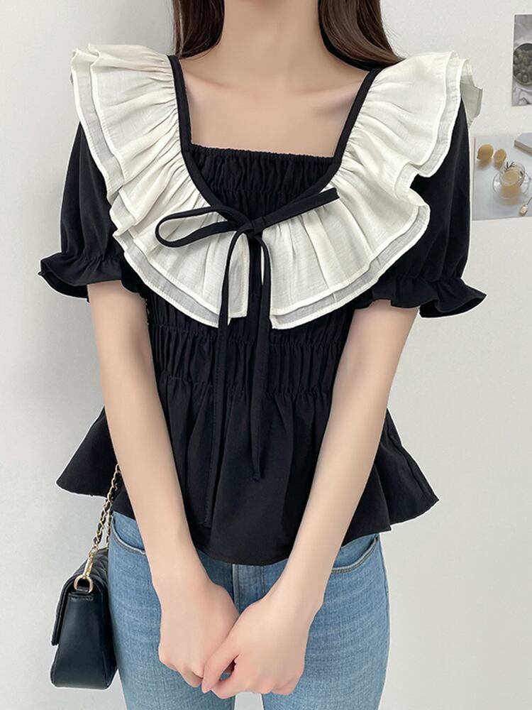 [EWQ] スクエアネック レースアップ シャツ パッチワーク 半袖 オーバーサイズ コントラストカラー レディース 夏潮トップス ショート ハーフスリーブ サマー 夏物 スクウェア