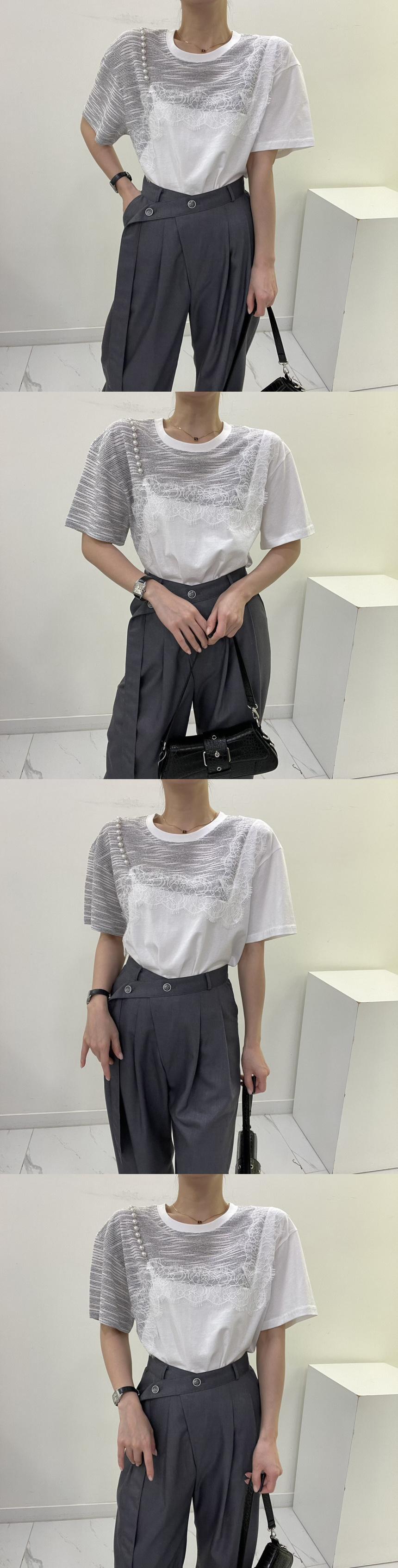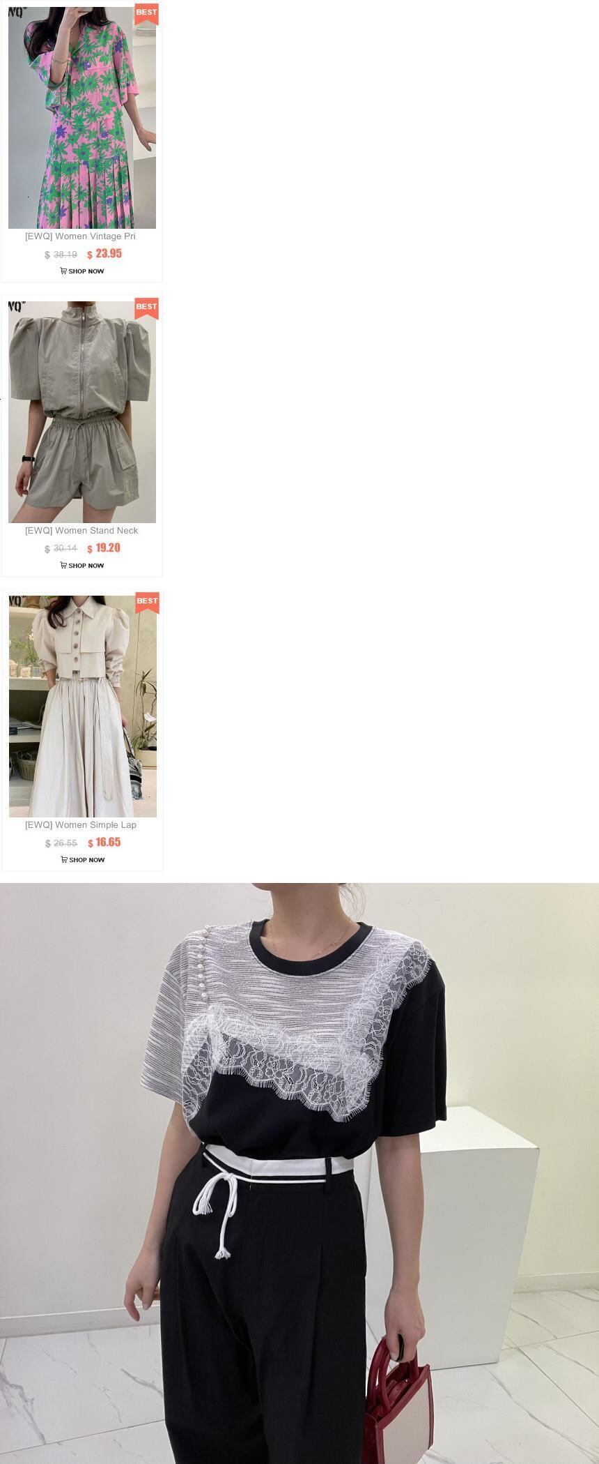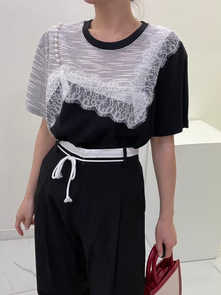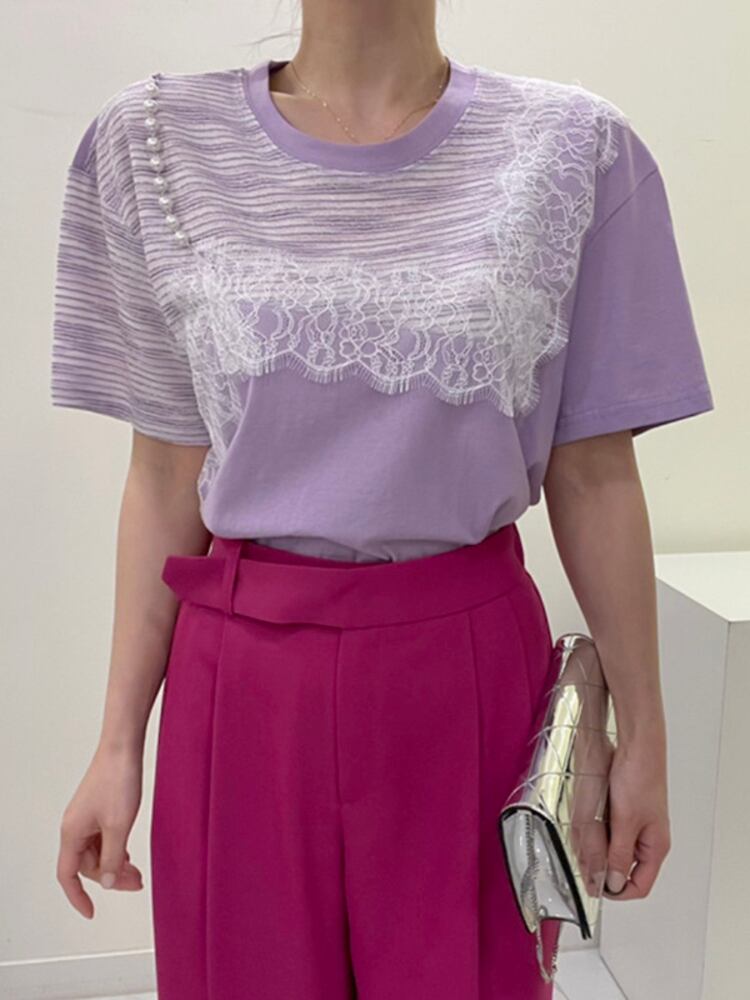 [EWQ] パープル Tシャツパールレーススプライスコントラストカラー Tシャツトップ夏潮パッチワーク半袖美しい T シャツ ショート ハーフスリーブ サマー 夏物 真珠