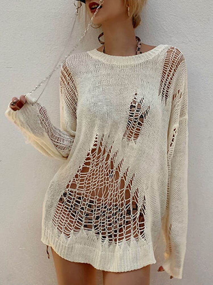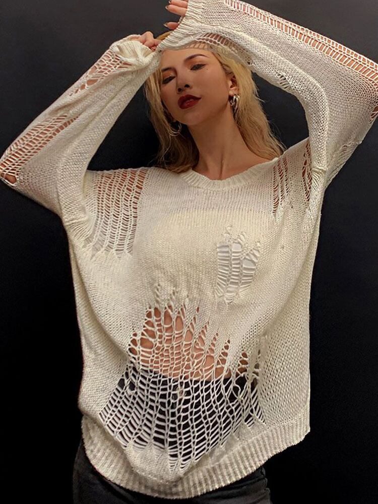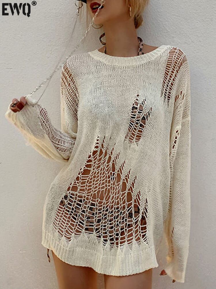 [EWQ] 中空アウトセクシーセータールーズニットトップス穴薄いプルオーバー長袖特大ストリートサマートップ ロング 夏物