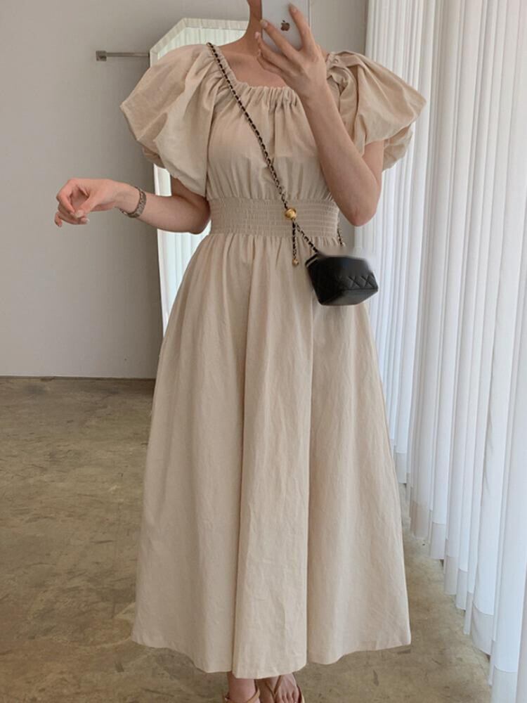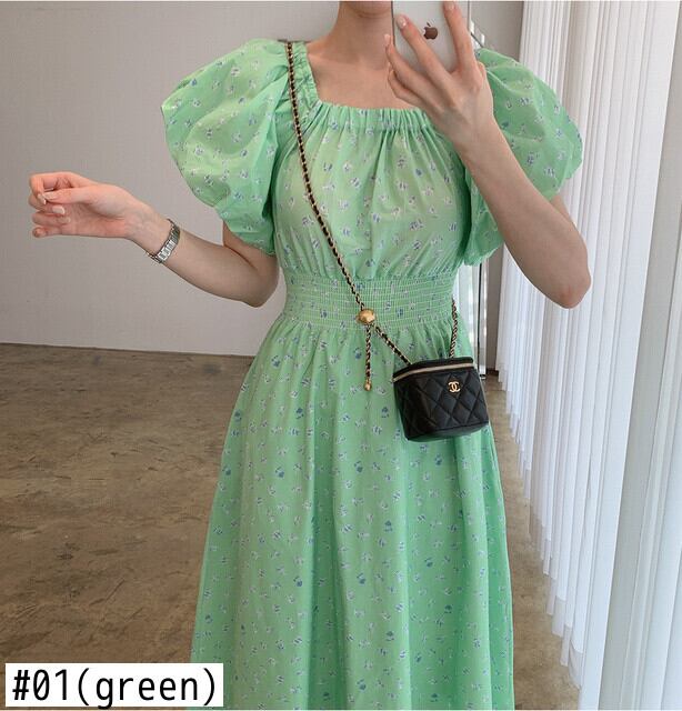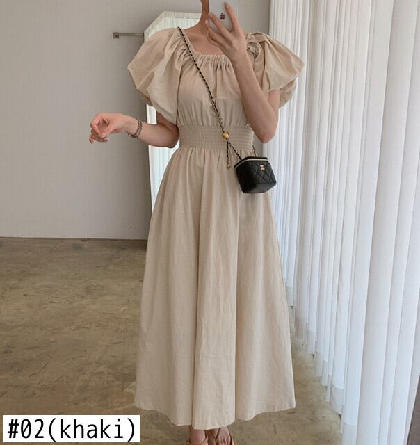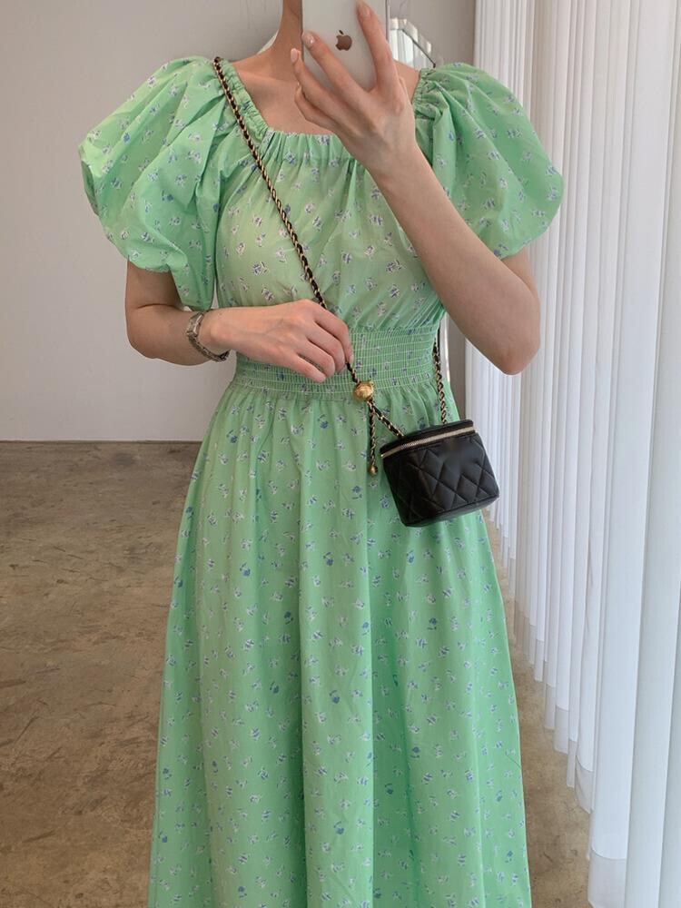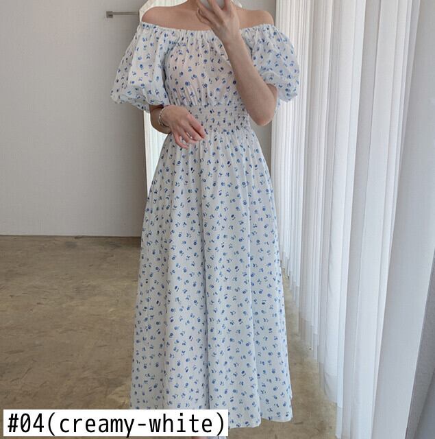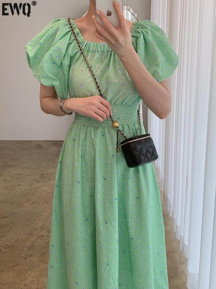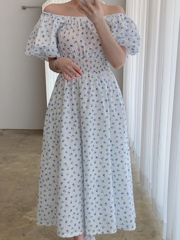 [EWQ] オフショルダーエレガントプリントドレスファッションプリーツウエスト弾性パフスリーブコントラストドレス夏新しい Vestido エラスティック 伸縮 サマー 夏物
