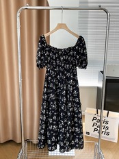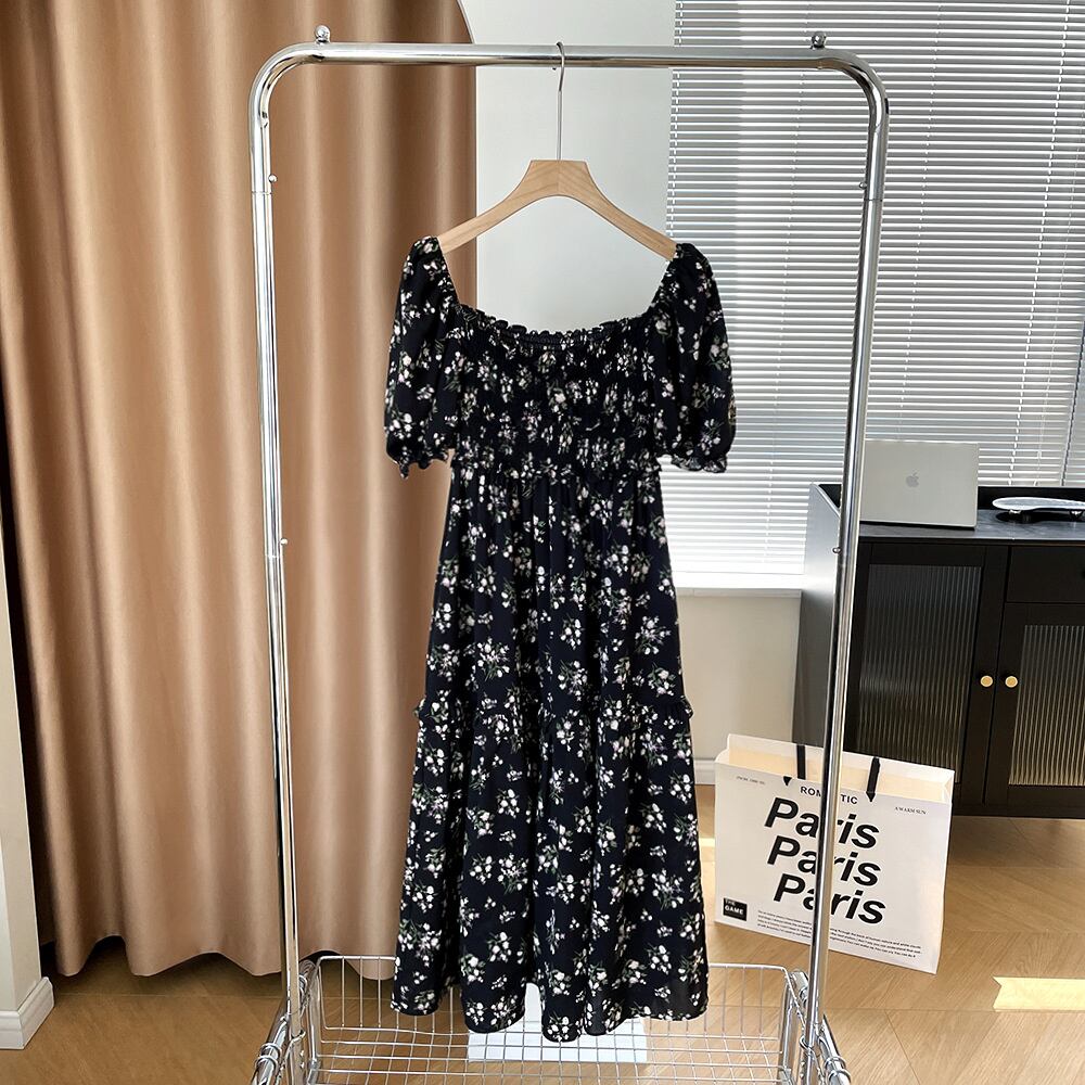[EWQ] V ネック花柄半袖ドレスコントラストカラーフラワースリムフィットウエスト夏潮パーティードレスローブ ショート ハーフスリーブ サマー 夏物 Vネック フラワーデザイン