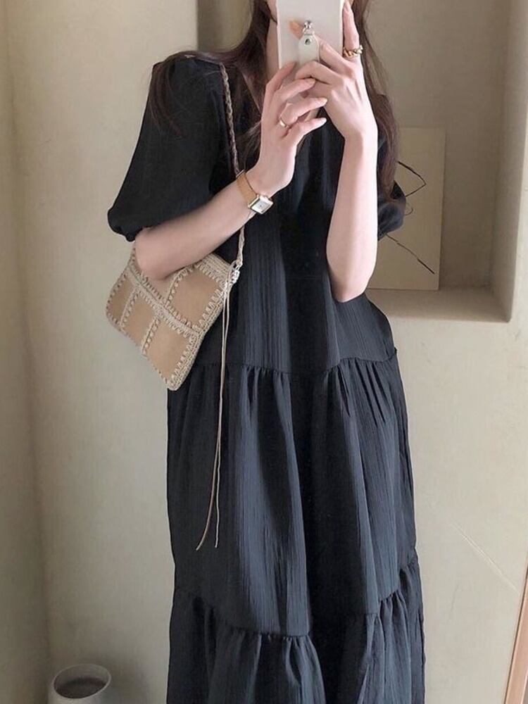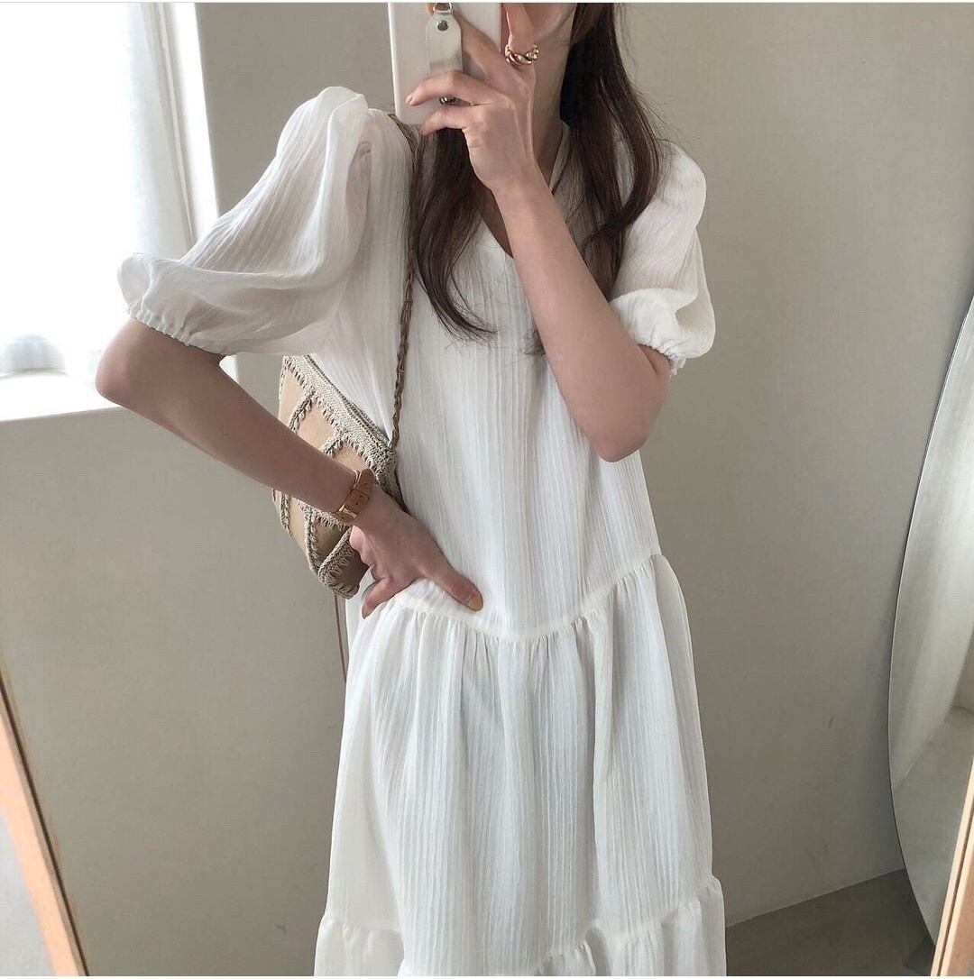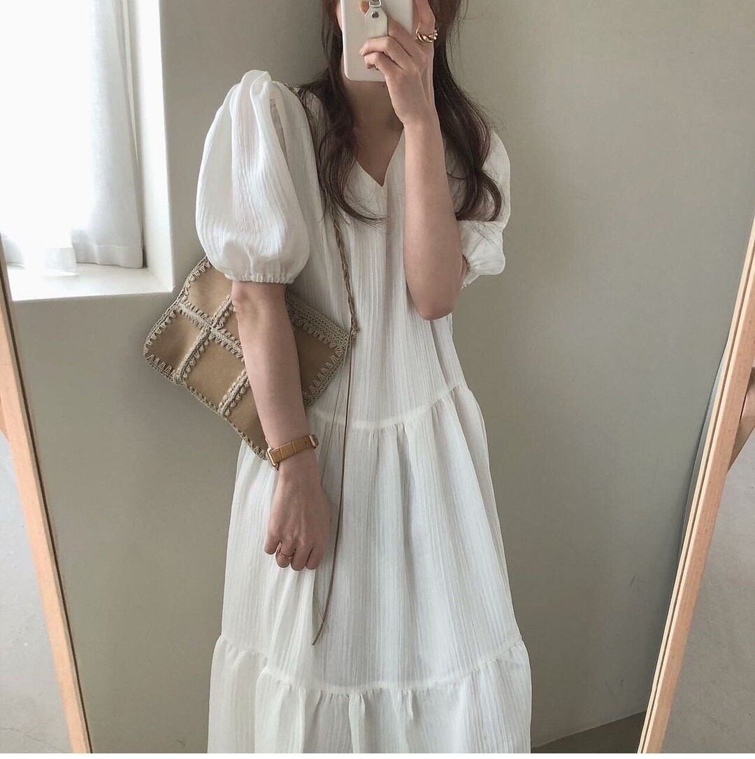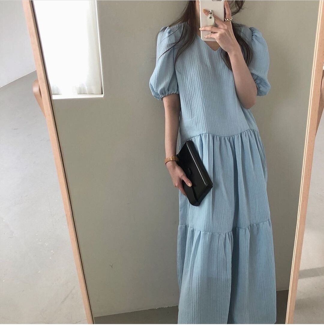 [EWQ] シンプルルーズロングドレスブルー V ネックパッチワークパフスリーブドレス夏潮 Vestidos サマー 夏物 Vネック