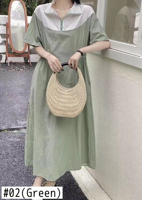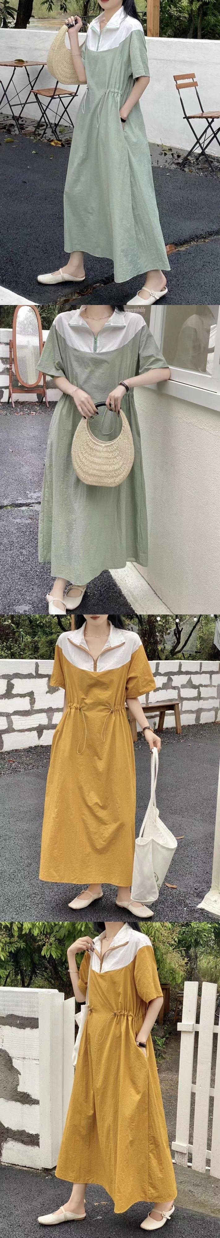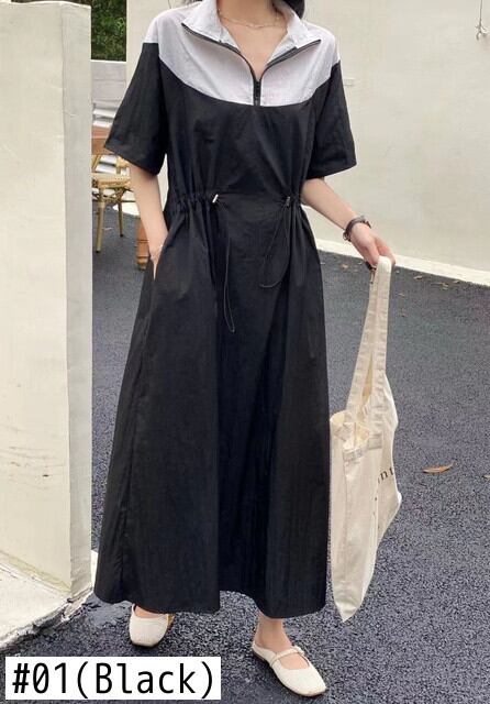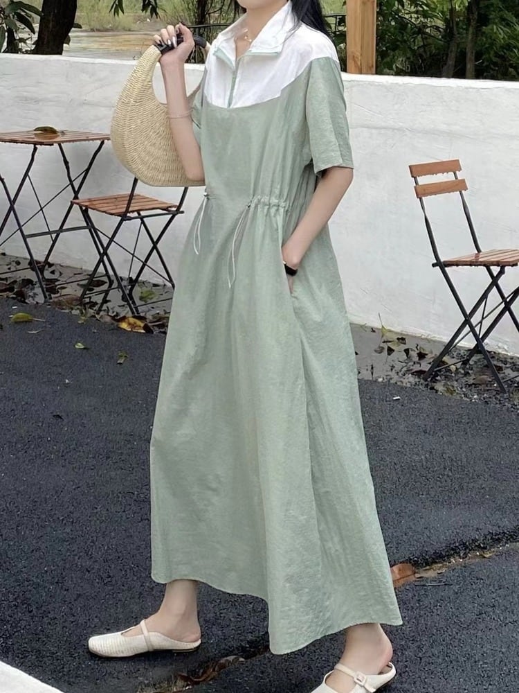 [EWQ] ラペルコントラスト巾着ドレス半袖パッチワークドレス夏潮ピンク Vestido ショート ハーフスリーブ サマー 夏物