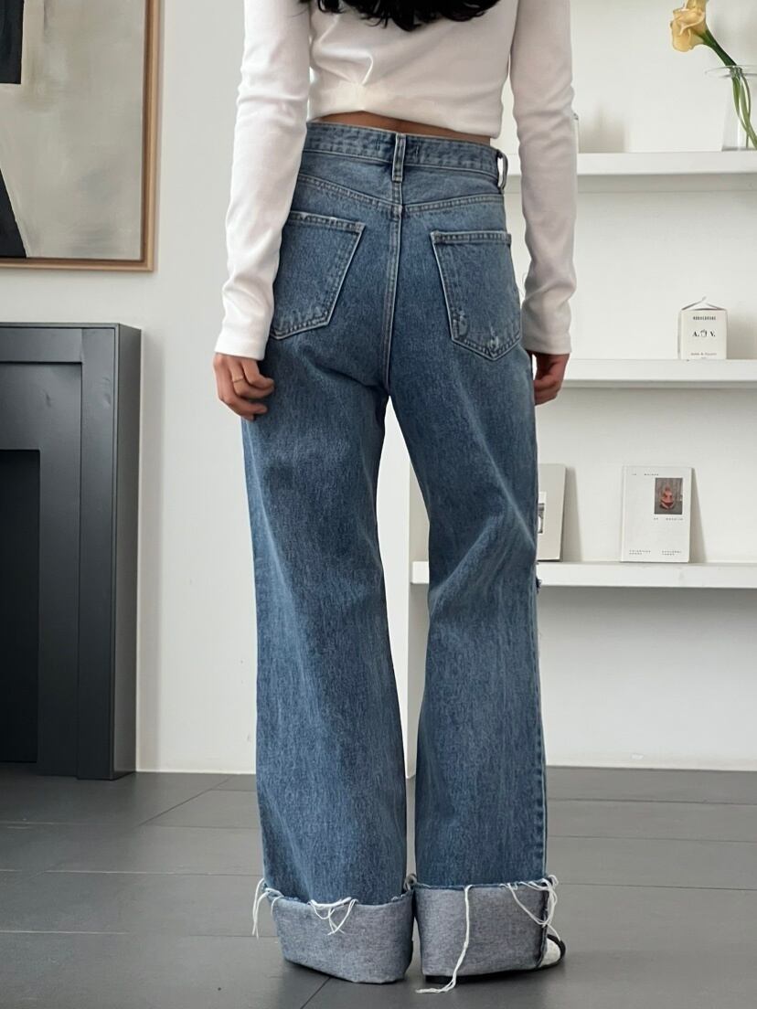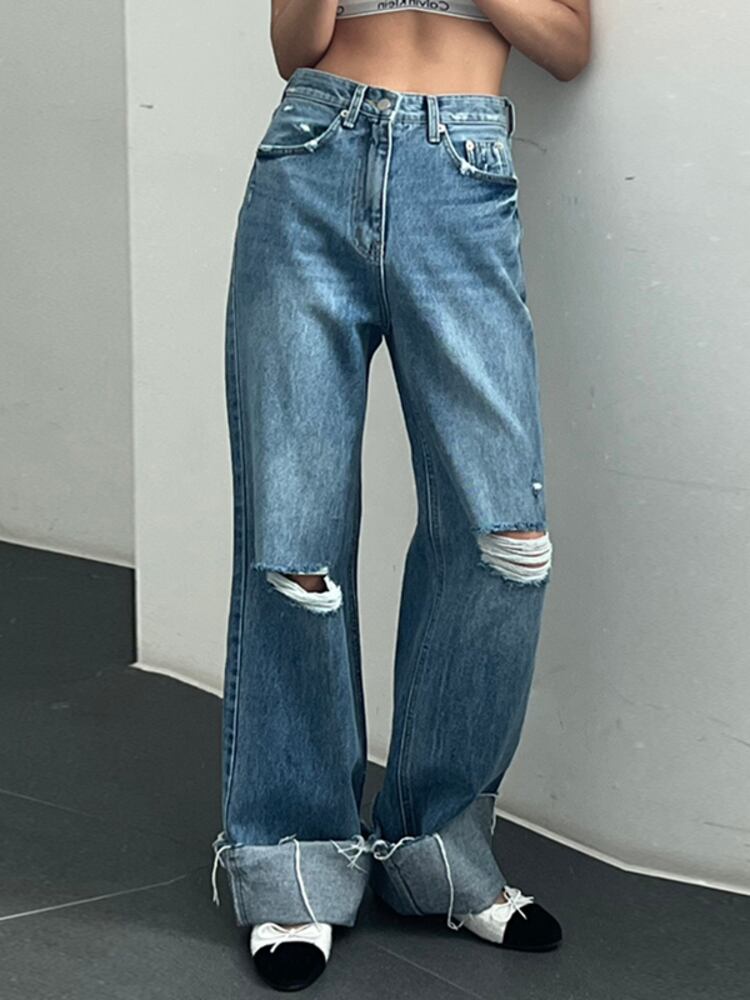 [EWQ] ストリートデニムパンツ穴パッチワークウエストカールストレートジーンズ夏潮 Y2K 服 9447 サマー 夏物