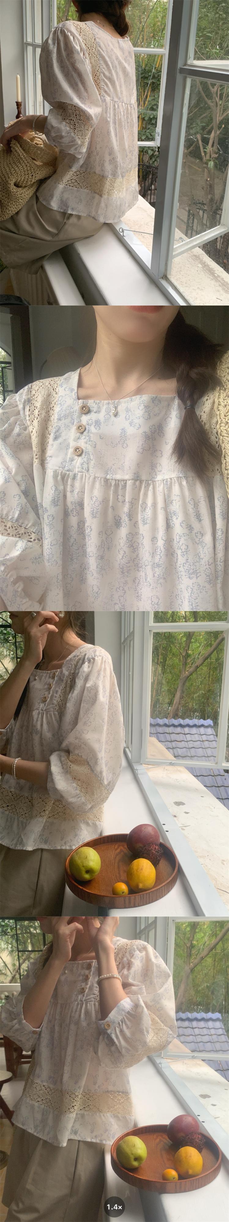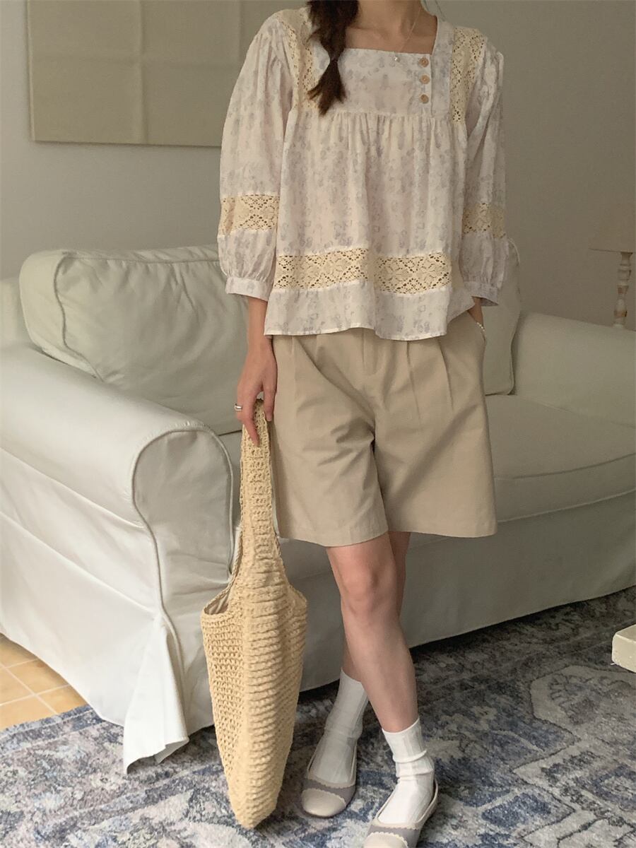 [EWQ] スクエアネックシャツレース中空シックボタンコントラストカラーパフスリーブトップ夏潮 16Y9121 サマー 夏物 スクウェア