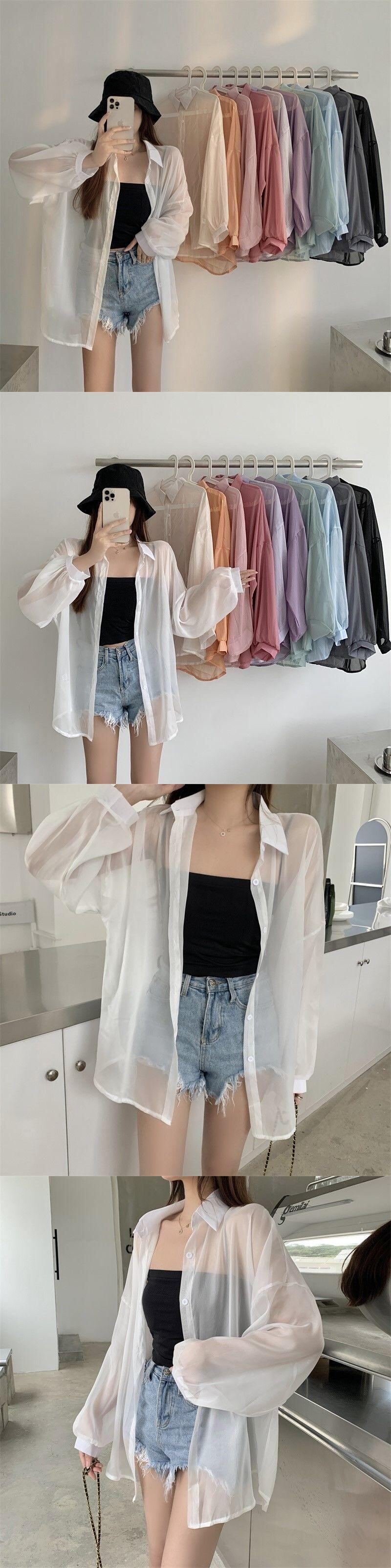 [EWQ] 裾非対称グリーンシャツ薄い視点夏服潮シングルブレスト長袖トップ 12 色 ロング サマー 夏物