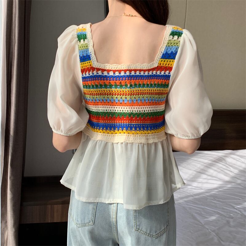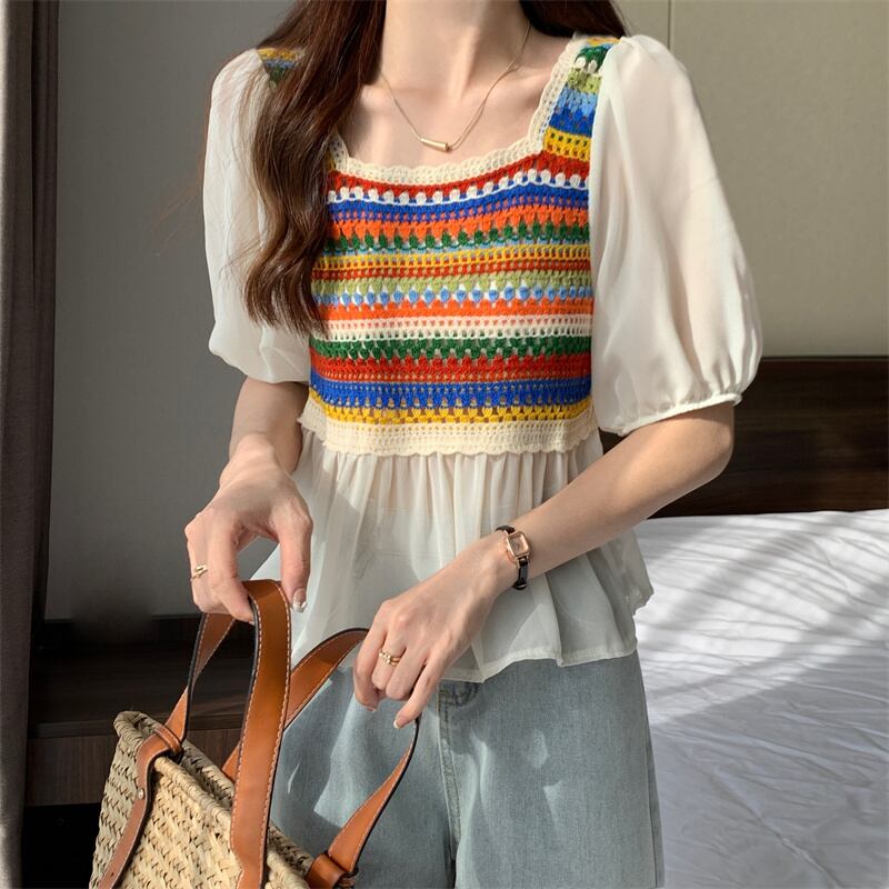 [EWQ] レディース スクエアネック スプライス レインボー シャツ フェイク ツーピース オーバーサイズ ランタン 半袖 夏 Y9846 ショート ハーフスリーブ サマー 夏物 スクウェア