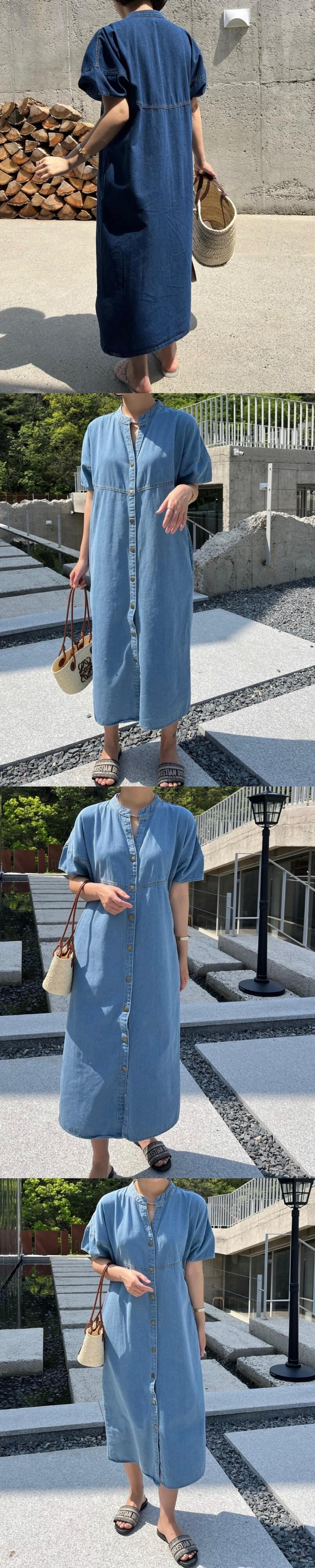 [EWQ] シングルブレストデニムドレスパフスリーブルーズフィットパッチワーク O ネックドレス夏ストレートローブ サマー 夏物 Oネック