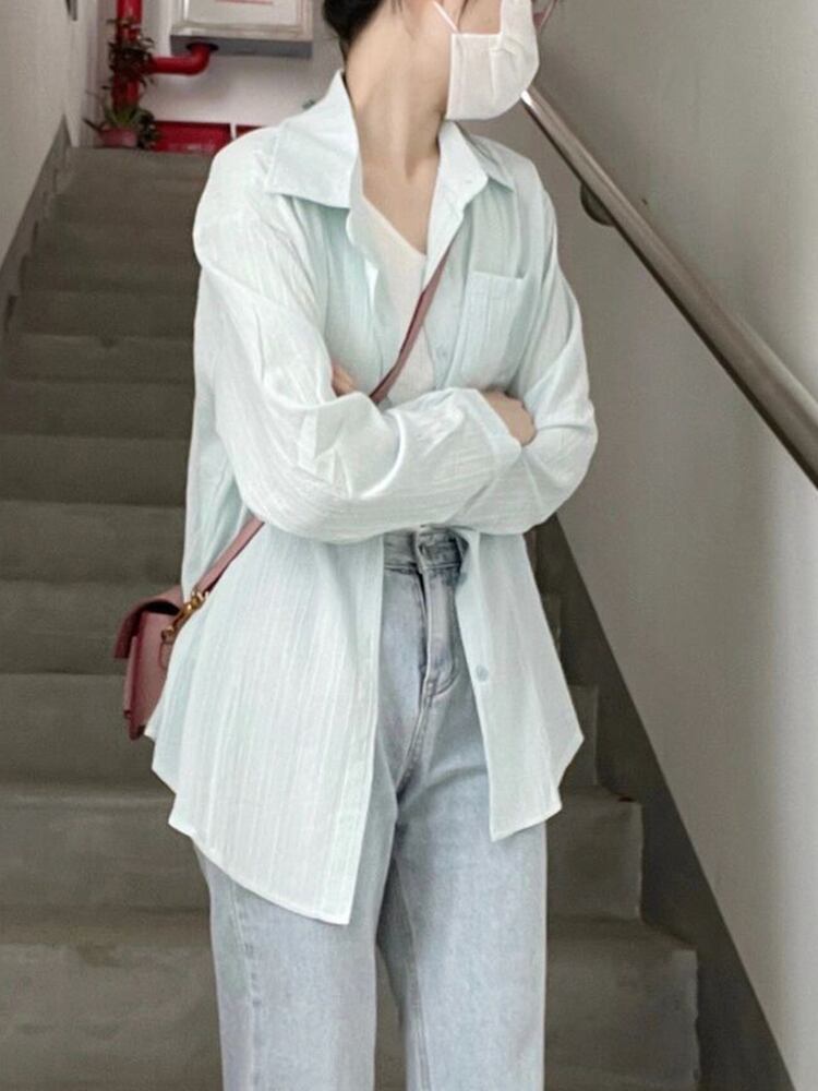 [EWQ] 折り長袖シャツ薄いシングルブレストルーズフィットポケットスプライス服夏トップオフィスシャツ ロング サマー 夏物 会社 学校 通勤や通学にも