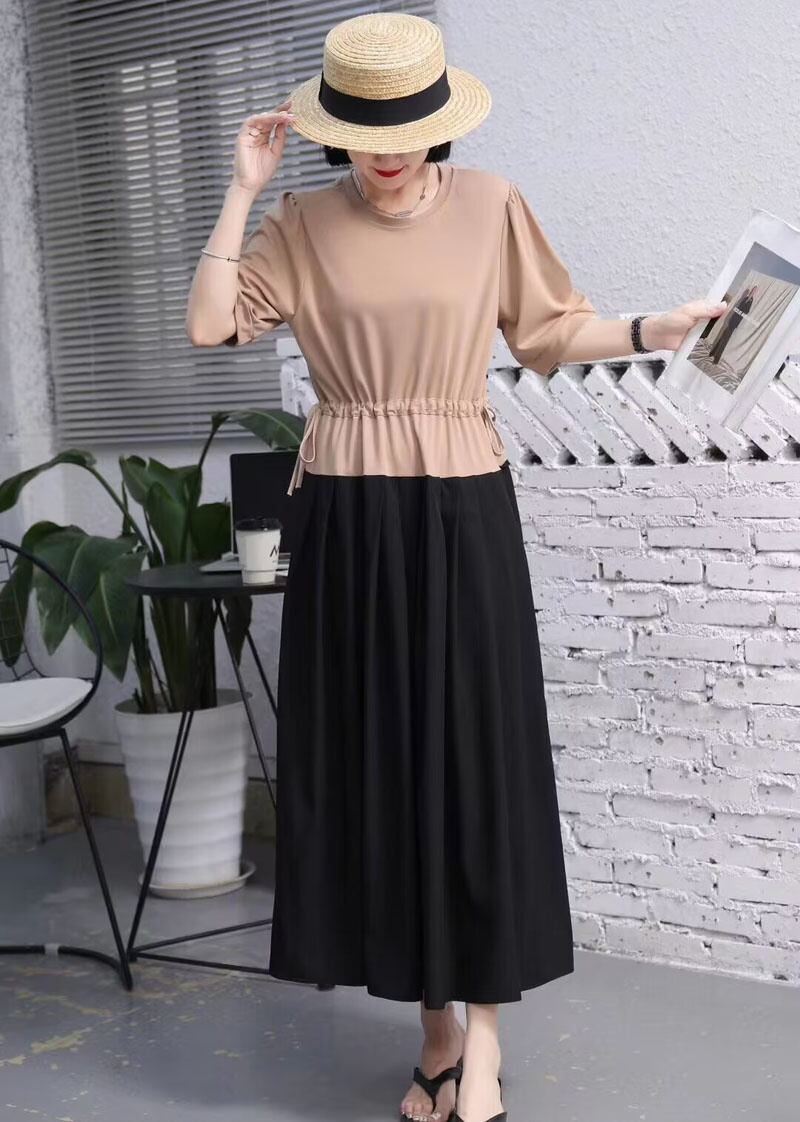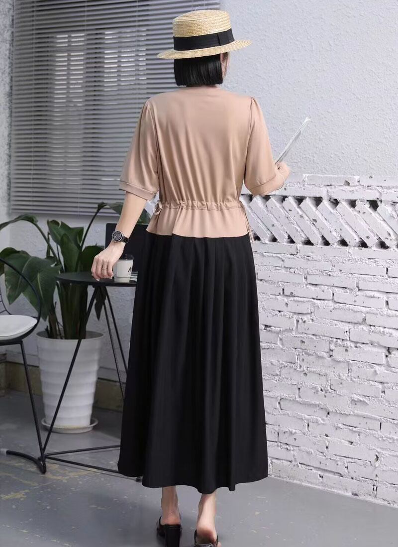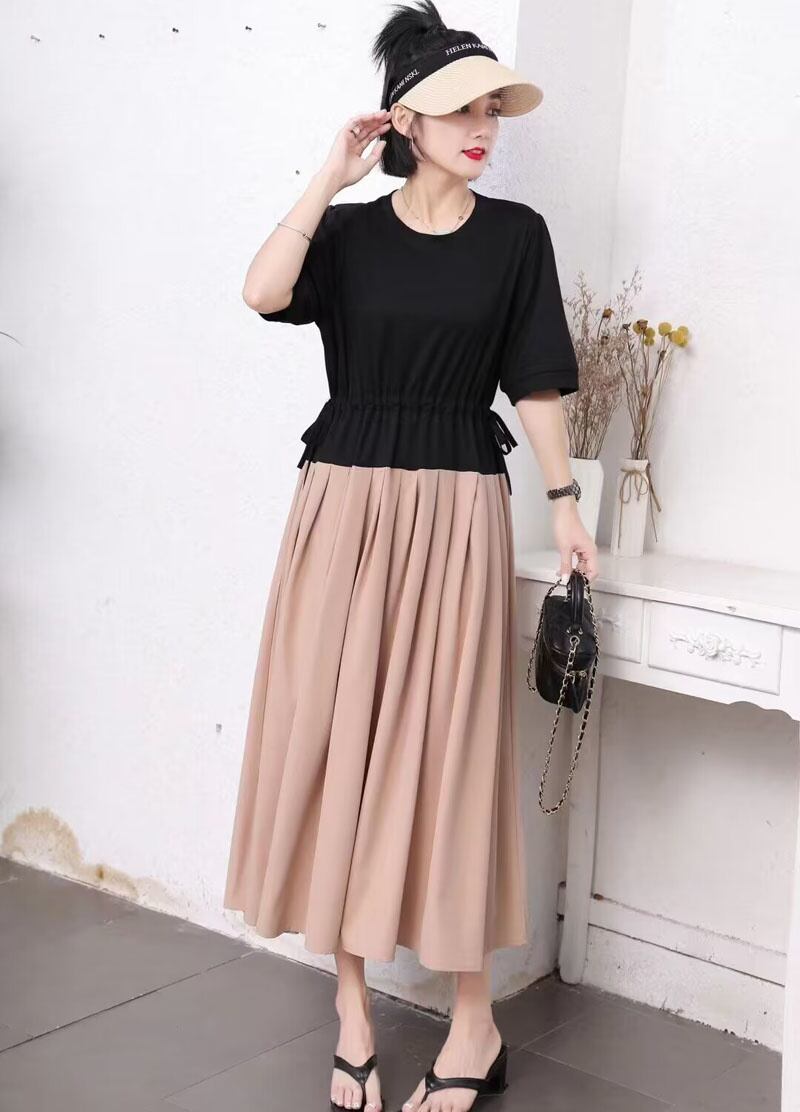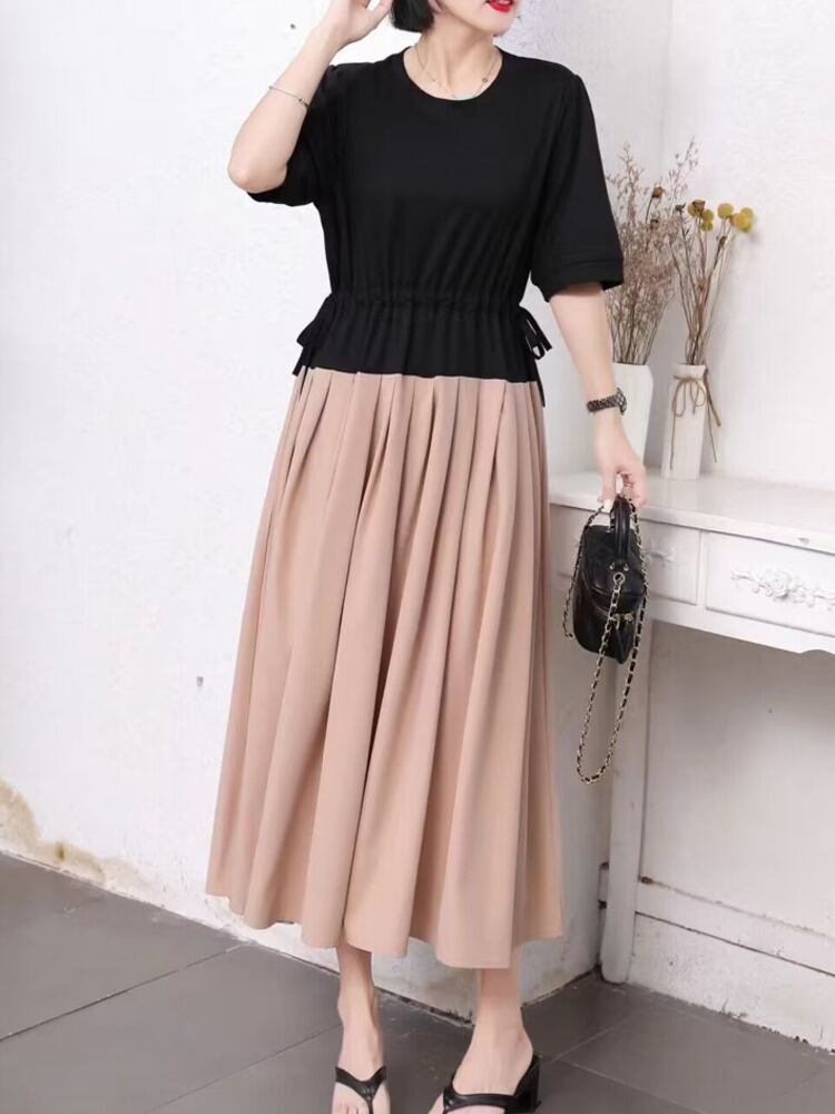 [EWQ] フェイクツーピース巾着ドレス半袖パッチワークフリルスプライスドレス夏潮ローブ ショート ハーフスリーブ サマー 夏物