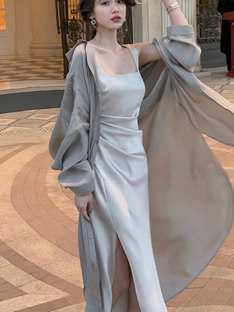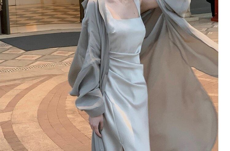 [EWQ] ビーチホリデーオープンステッチロングシャツレディースホワイトパースペクティブランタンスリーブルーズフィットサマータイドトップ 夏物