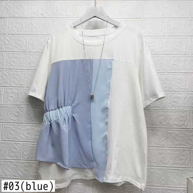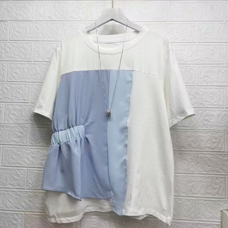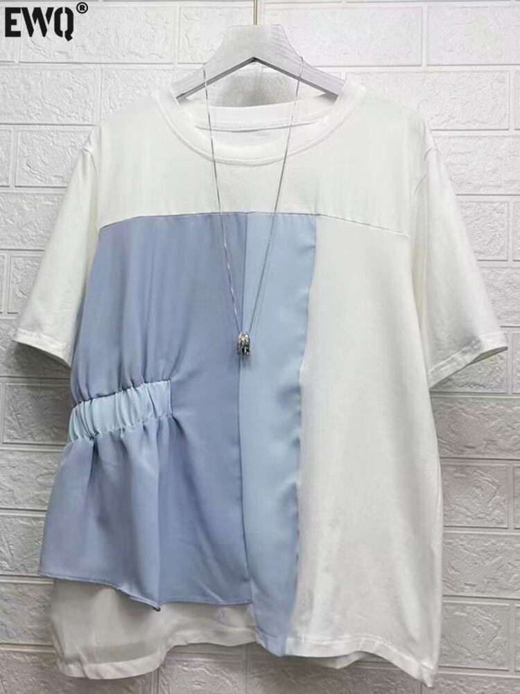 [EWQ] パッチワーク非対称フェイクツーピース Tシャツコントラストカラールーズフィット O ネック Tシャツトップス夏潮 サマー 夏物 Oネック