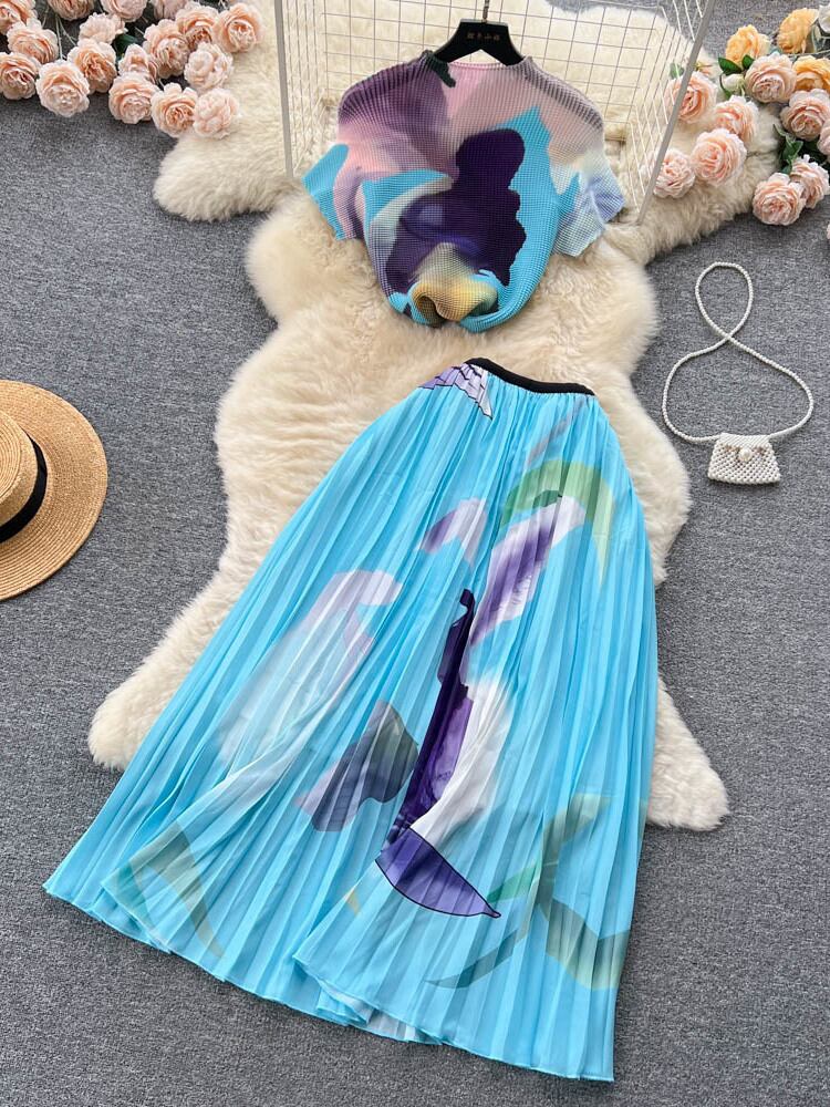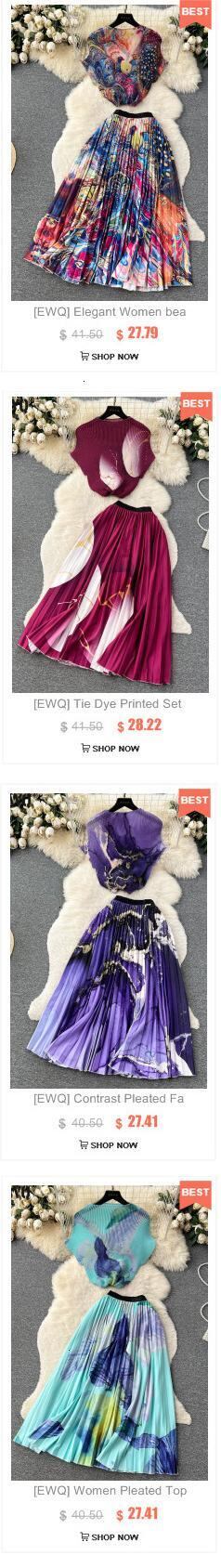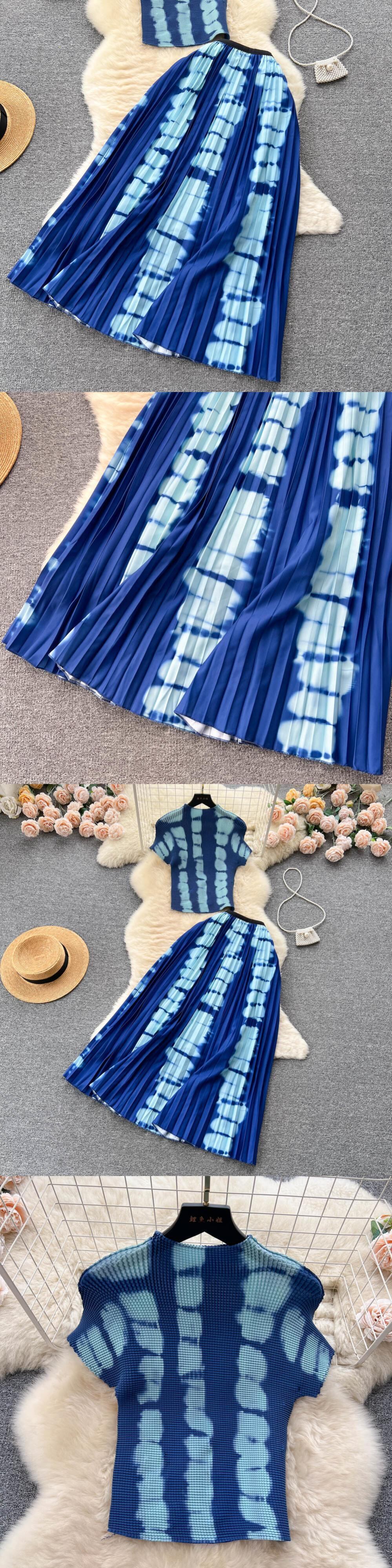 [EWQ] タイダイスーツスリムフィット弾性プリーツトップ + ウエストコントラストスカート夏潮美しいパーティーセット エラスティック 伸縮 サマー 夏物