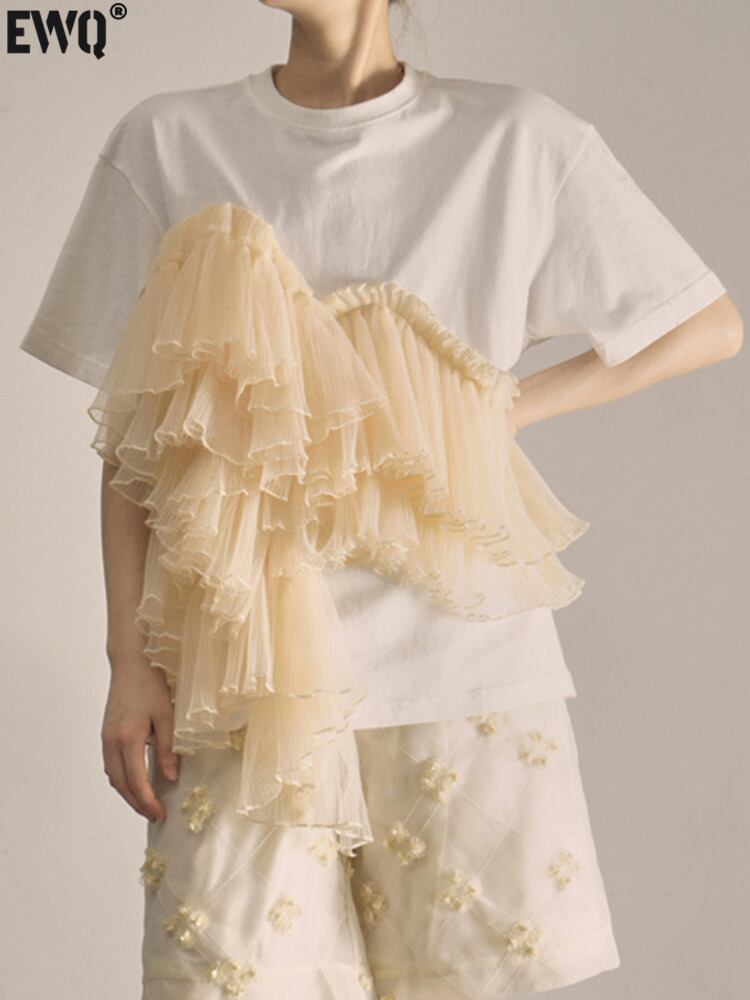 [EWQ] 不規則メッシュスプライス Tシャツパッチワークルーズフィット O ネック Tシャツトップ夏潮半袖 T シャツ ショート ハーフスリーブ サマー 夏物 Oネック