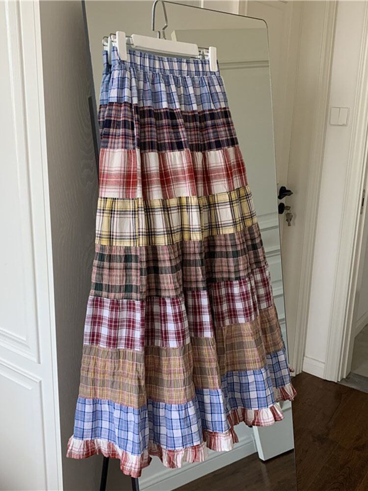 [EWQ] スカートチェックパッチワークコントラストカラーウエスト弾性ミッドカーフスカート夏潮 16U40 レッド エラスティック 伸縮 サマー 夏物
