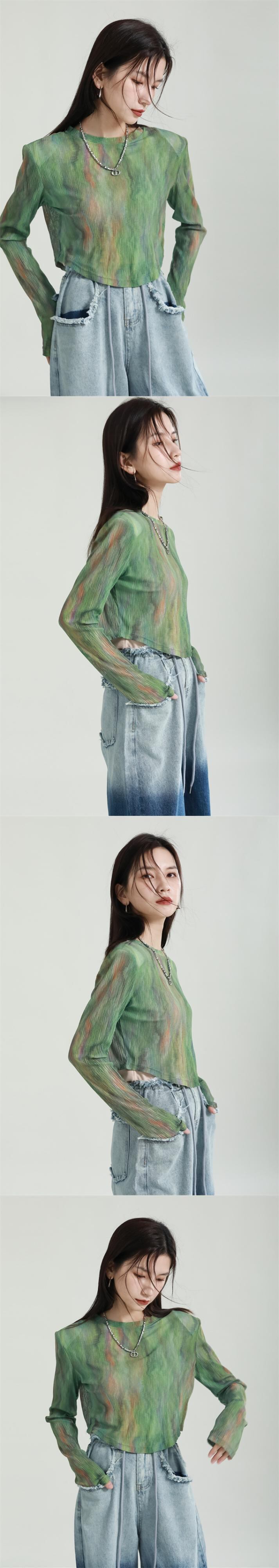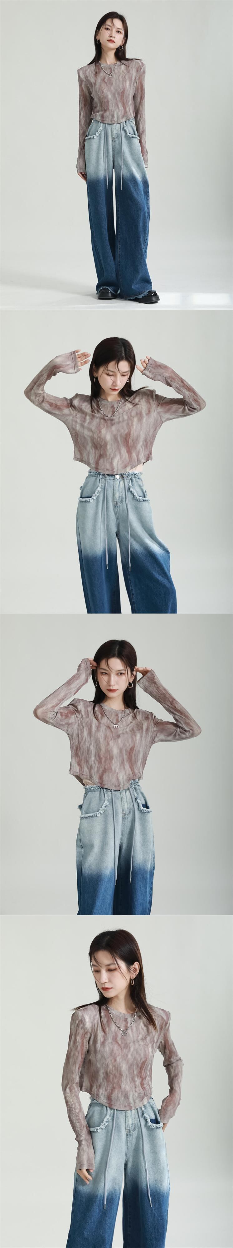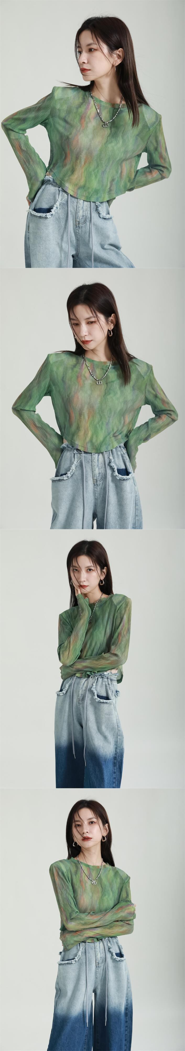[EWQ] レディース グラデーション プリント Tシャツ 長袖 コントラスト タイダイ パッチワーク 不規則 O ネック ボトリング シャツ Tシャツ トップ 9719 ロング Oネック