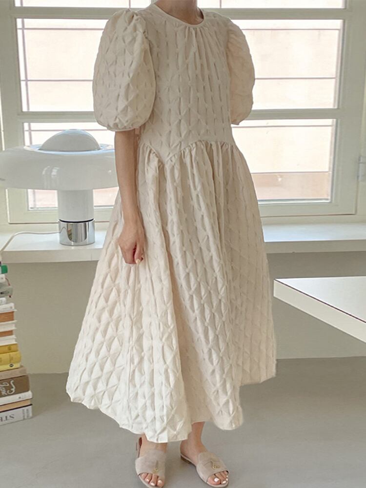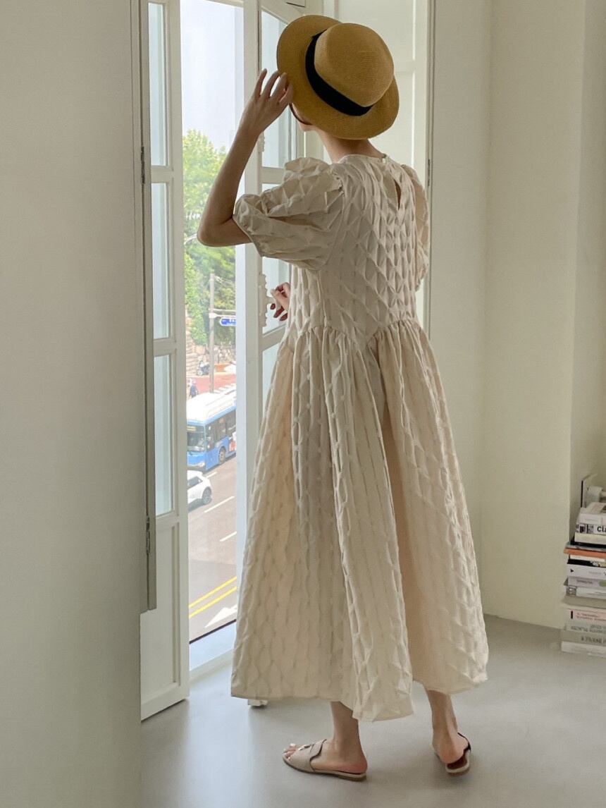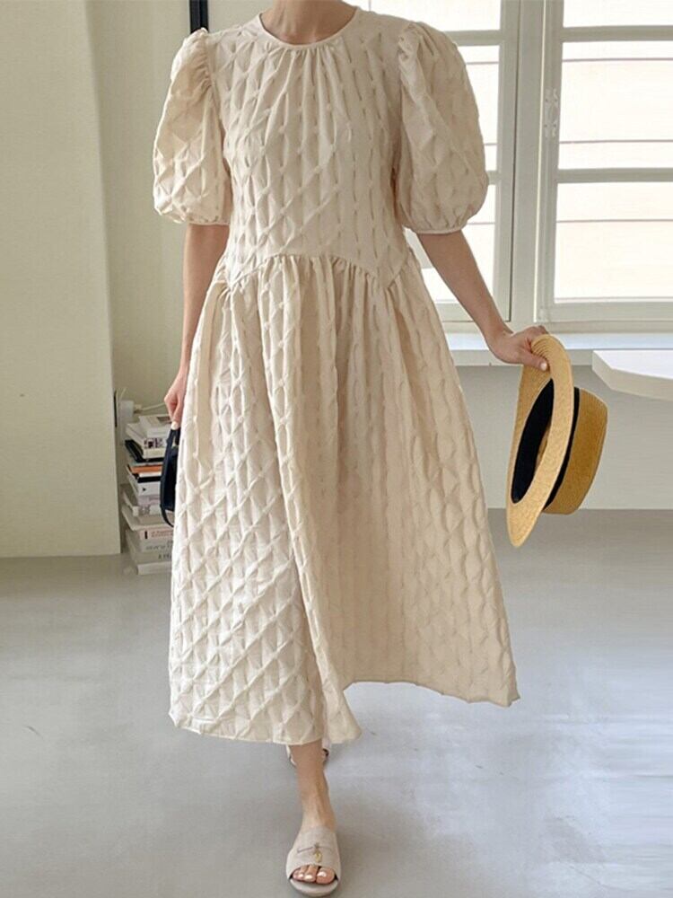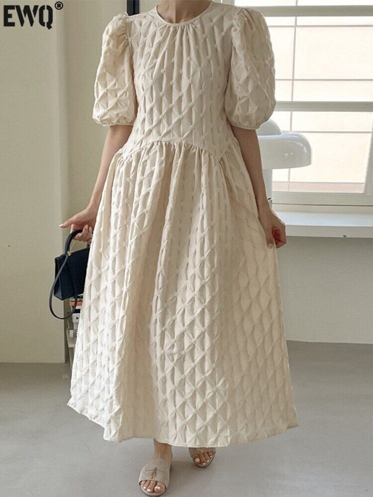 [EWQ] 3D バブルチェック柄ドレスソリッドカラープリーツウエストルーズフィット半袖ドレス夏潮 Vestido ショート ハーフスリーブ サマー 夏物