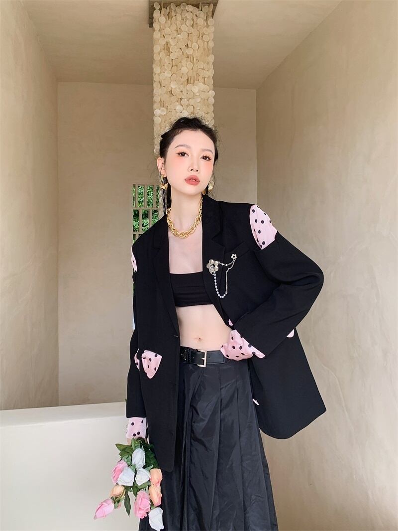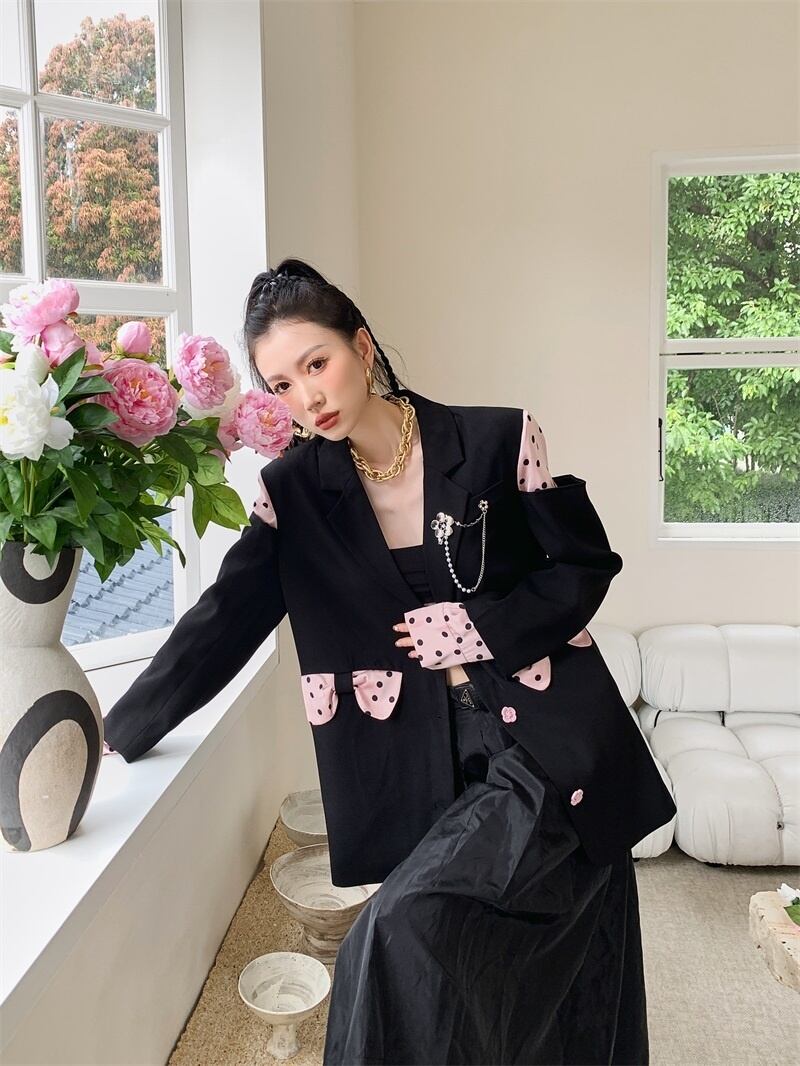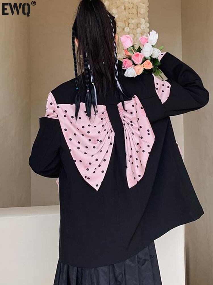 [EWQ] バックちょう結びブレザーコート ファッション 長袖 パッチワーク コントラスト ルーズ シック ボタン スーツ ジャケット 夏 ブラック ロング リボン サマー 夏物