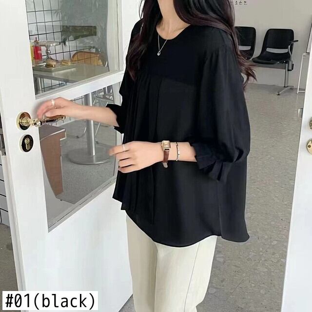 [EWQ] プリーツソリッドカラーパッチワーク Tシャツルーズフィット因果ランタンスリーブ Tシャツトップ夏潮 6U69 サマー 夏物