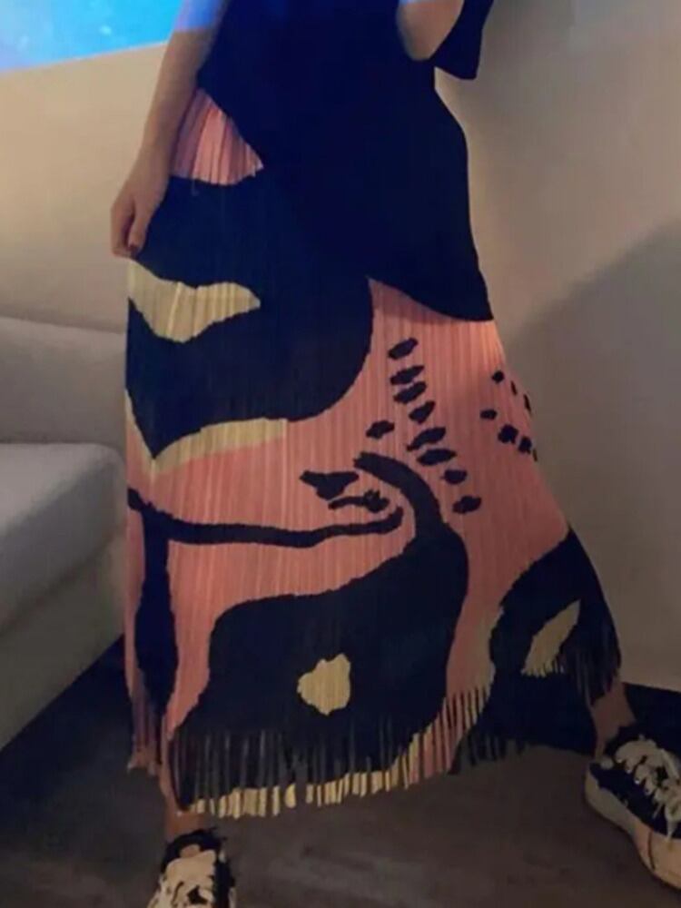 [EWQ] フラワープリーツテルスカートウエスト弾性コントラストカラースカート夏潮服 エラスティック 伸縮 サマー 夏物 フラワーデザイン