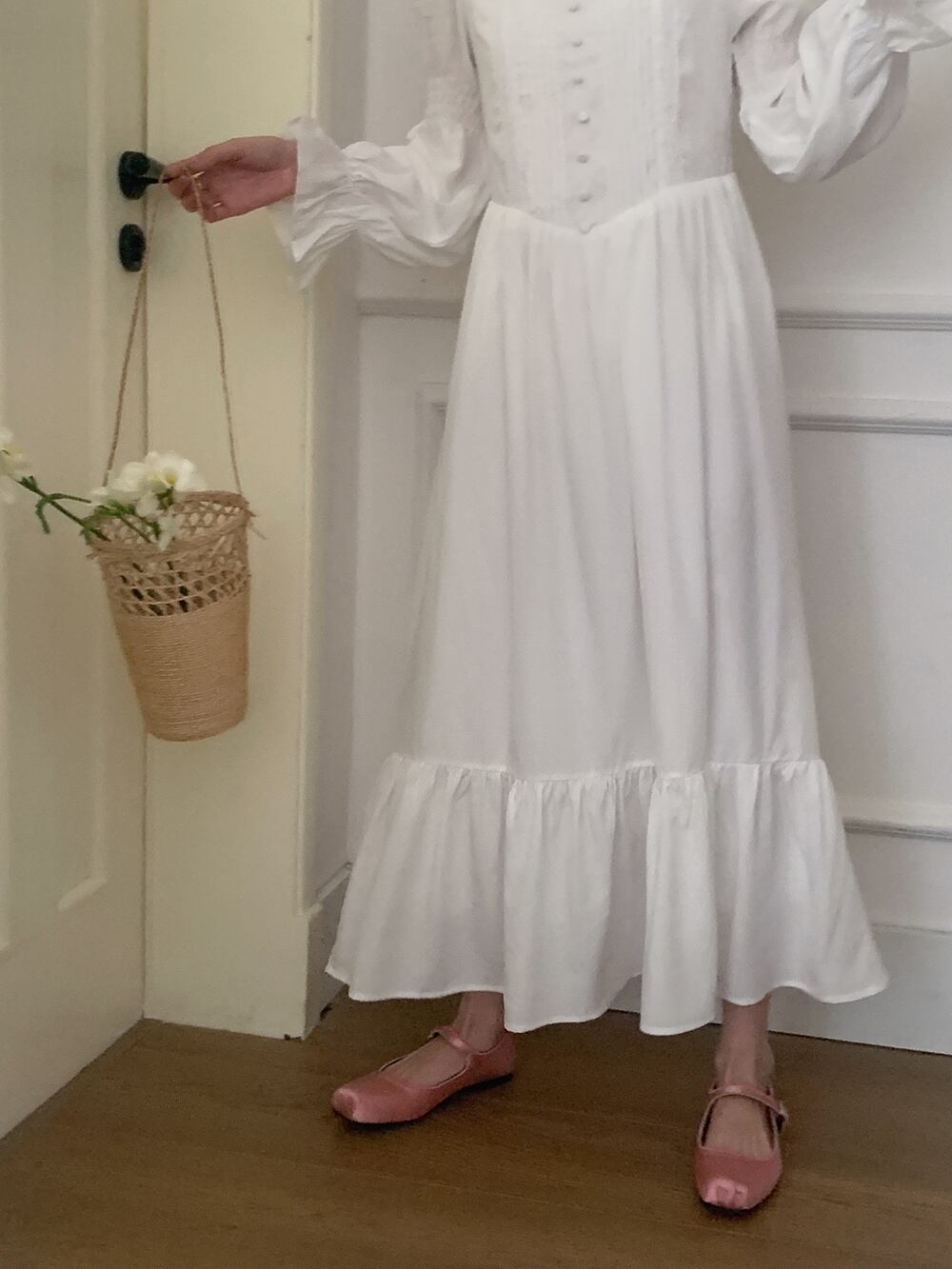 [EWQ] ソフトスクエアネックプリーツウエスト Shdress ソリッドカラーフレアスリーブドレス夏秋白ローブ 16Y745 ホワイト サマー 夏物 オータム 秋物 スクウェア