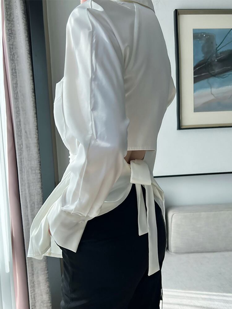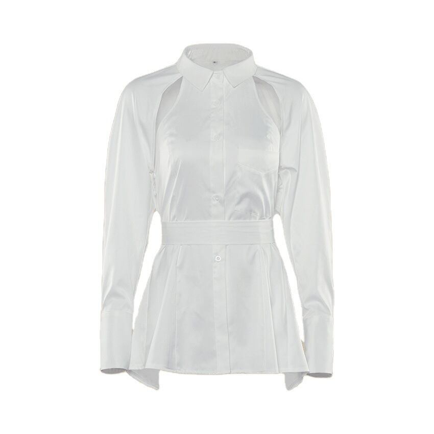 [EWQ] 中空アウトブラウスラペル長袖パッチワークリボンチュニックシャツ美しい夏 ロング サマー 夏物