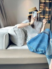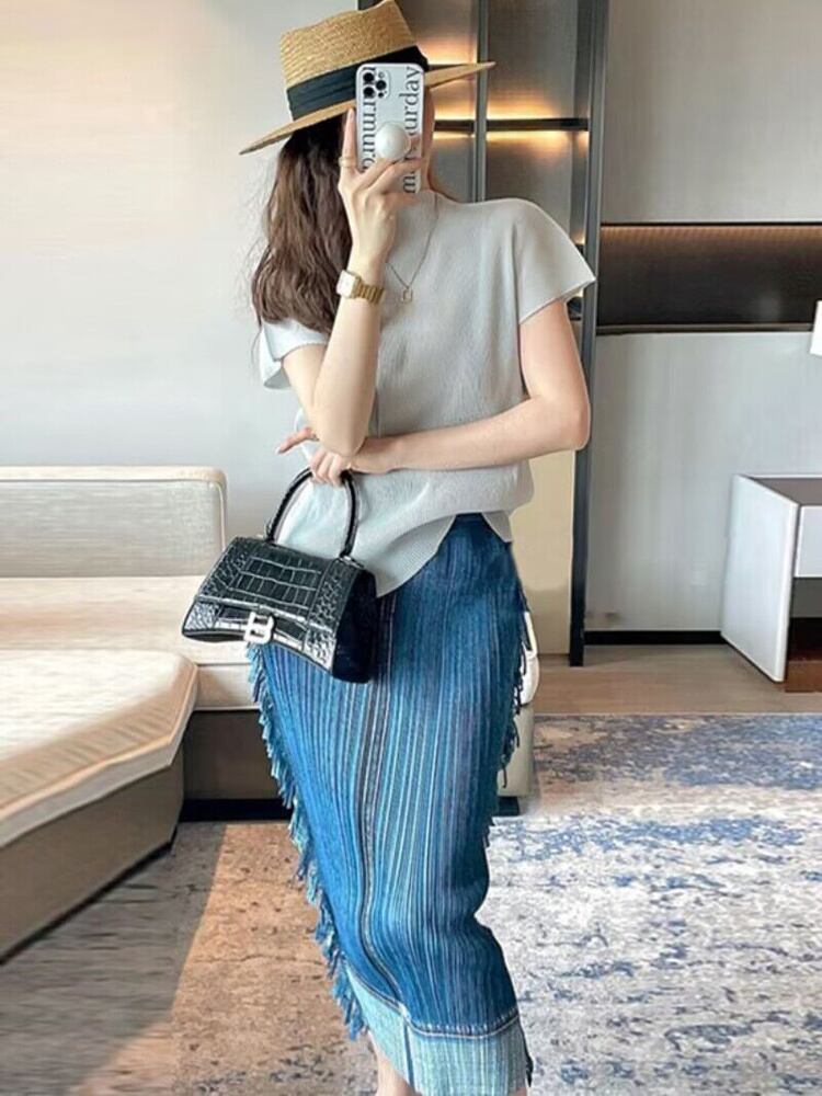 [EWQ] プリーツ Lmitation デニムスカートパッチワークコントラストテルストレートスカート夏潮ウエスト段 Faldas サマー 夏物