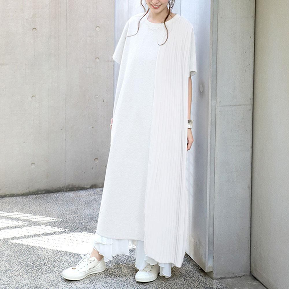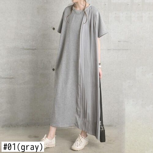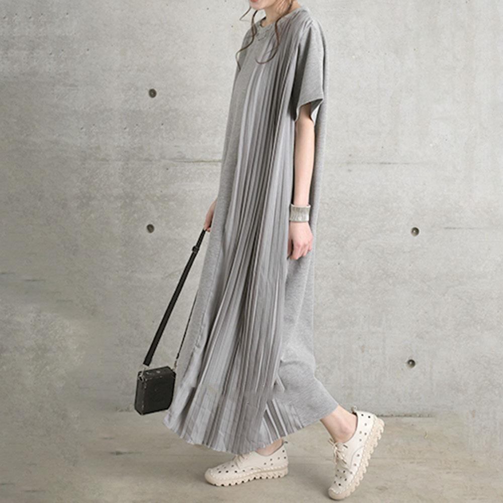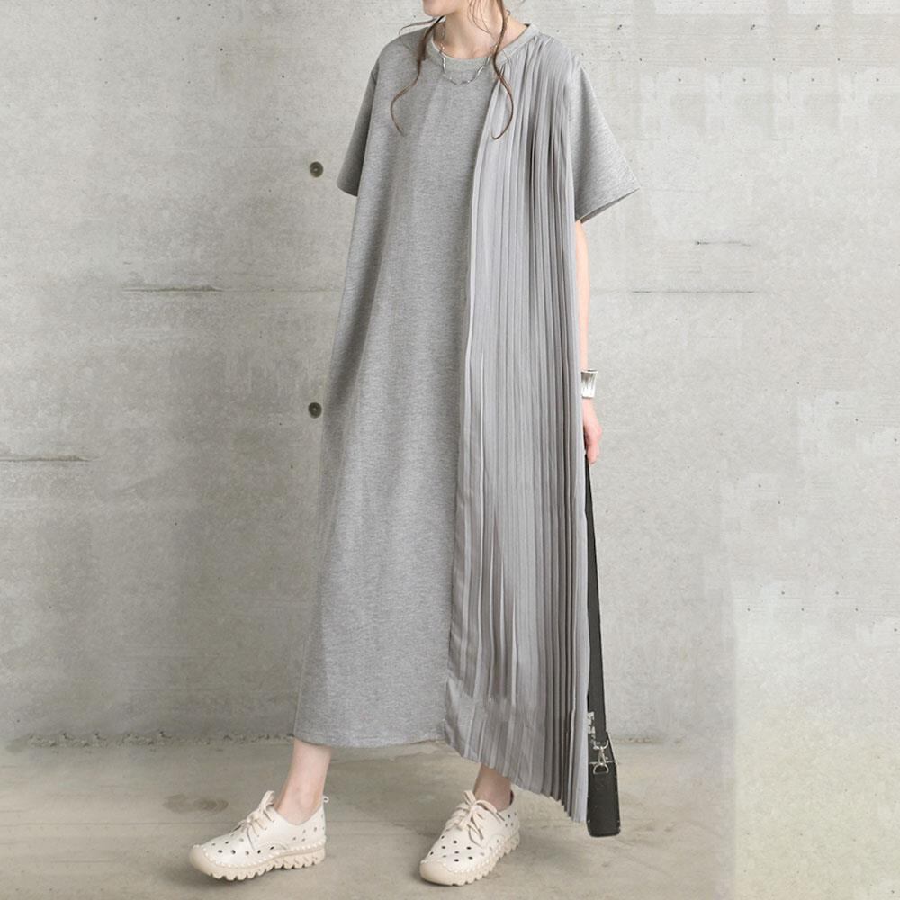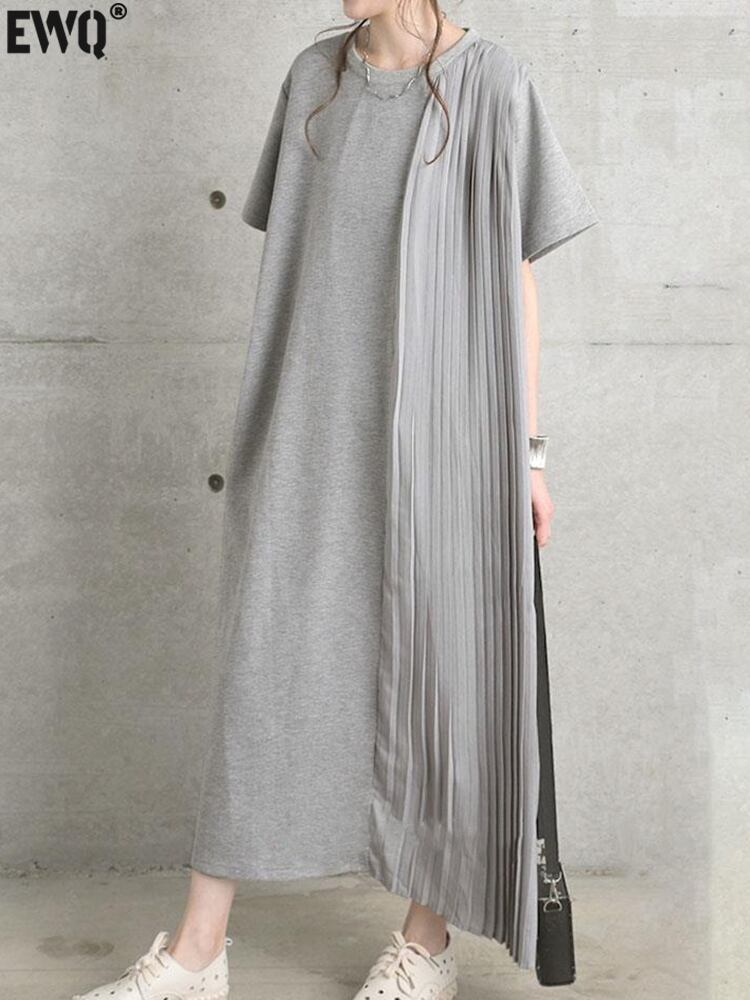 [EWQ] サイドプリーツスプライシングソリッドカラードレス半袖ルーズマキシドレスサマーローブ 514 ショート ハーフスリーブ 夏物
