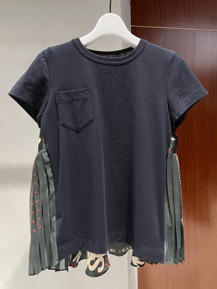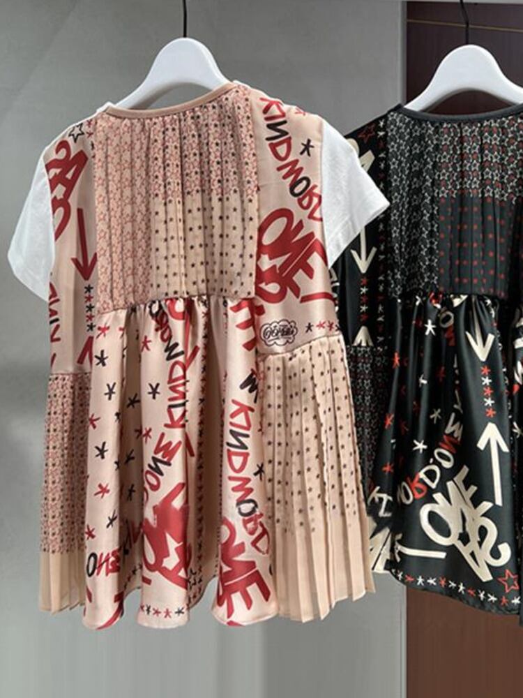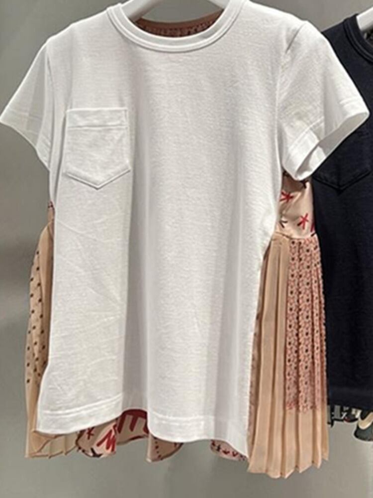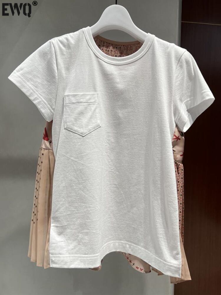 [EWQ] プリントレターパッチワーク Tシャツポケットスプライスコントラストカラールーズフィット O ネック Tシャツトップ夏潮 サマー 夏物 Oネック
