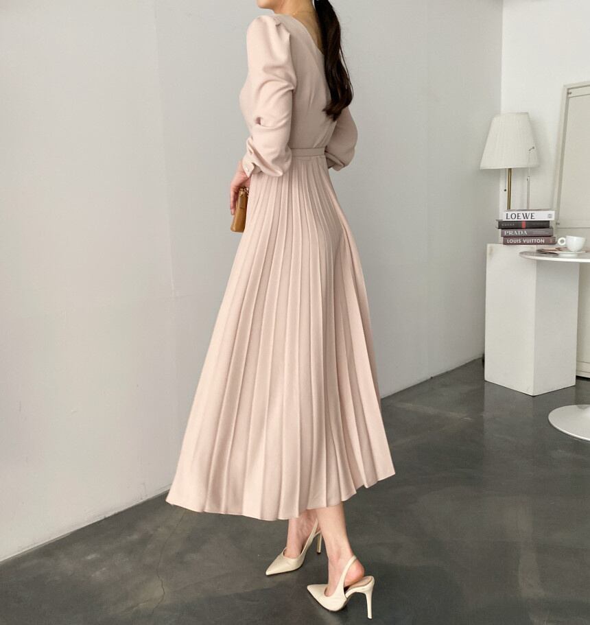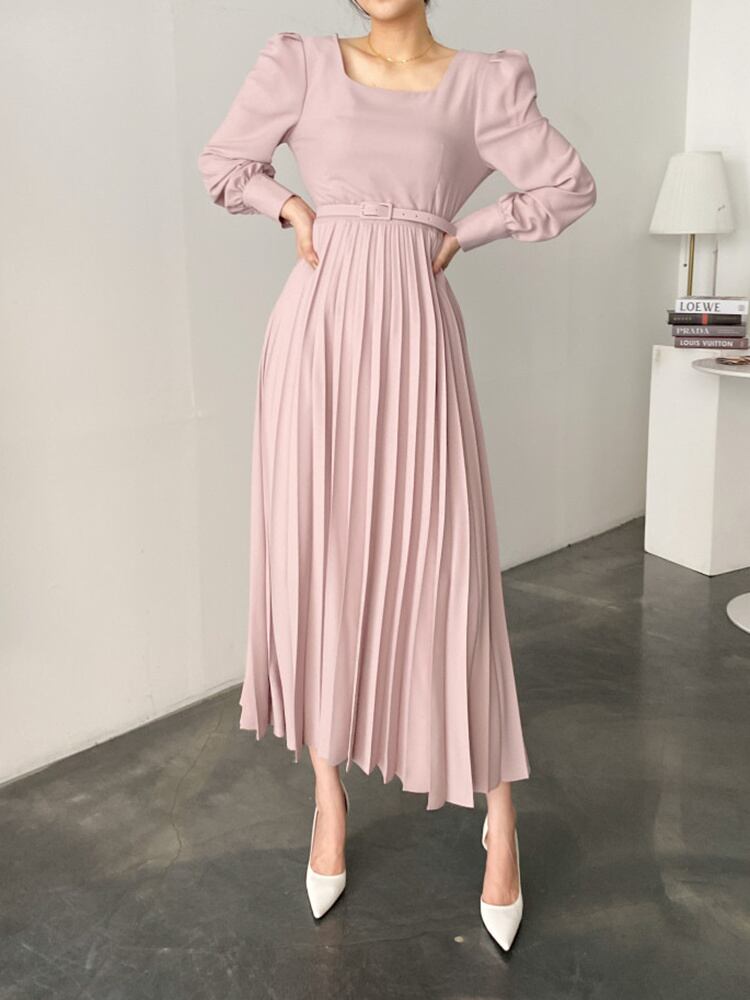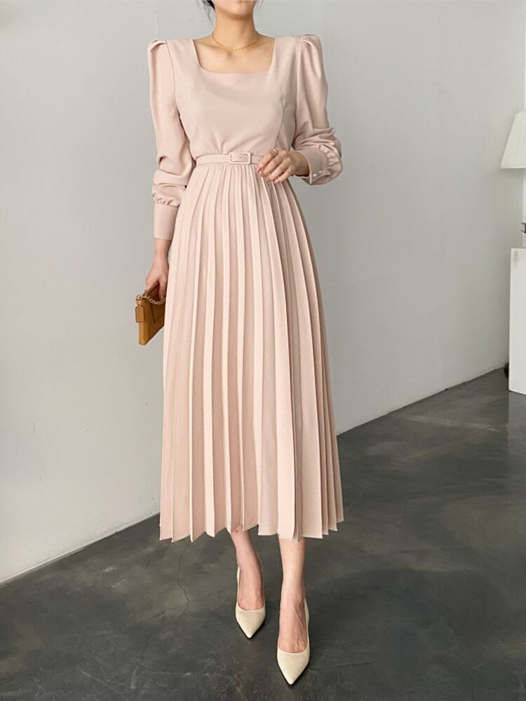 [EWQ] シンプルソリッドカラースクエアカラー長袖ドレスプリーツルーズウエストドレス夏 16Y1274 ロング サマー 夏物 スクウェア