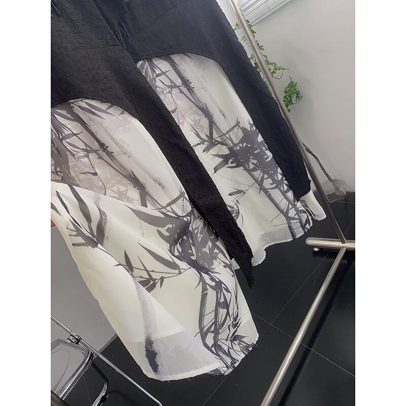 [EWQ] シックボタンリボンパッチワークドレス半袖コントラストプリントシフォンスプライスドレスサマータイドローブ 夏物 ショーツ ブルマー