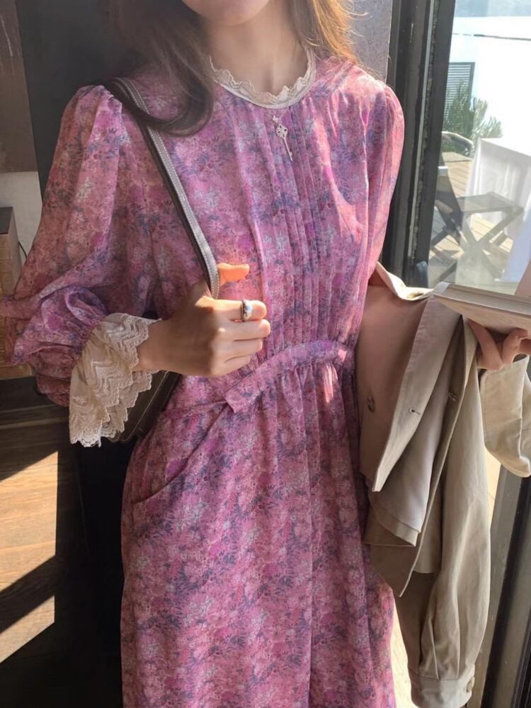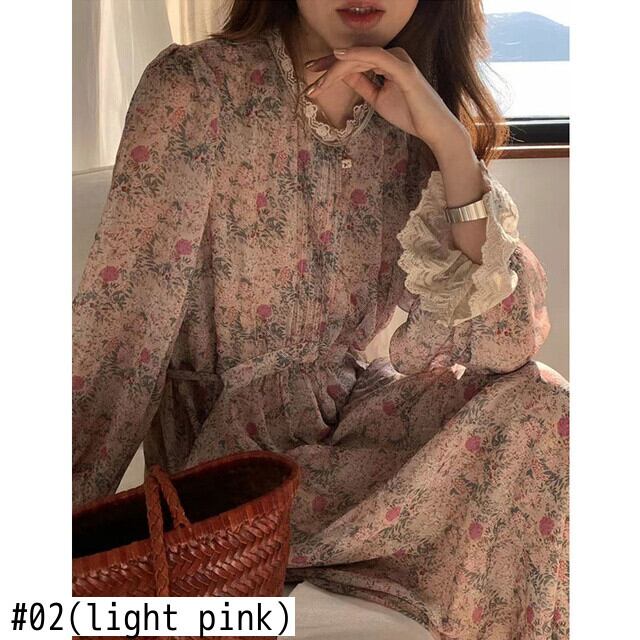 [EWQ] 甘いコントラストレーススプライシングシフォン花美しいドレスパッチワーク長袖フラワーマキシドレス夏 ロング 大人ガーリー スウィート キュート カジュアル サマー 夏物 花柄 フラワーデザイン