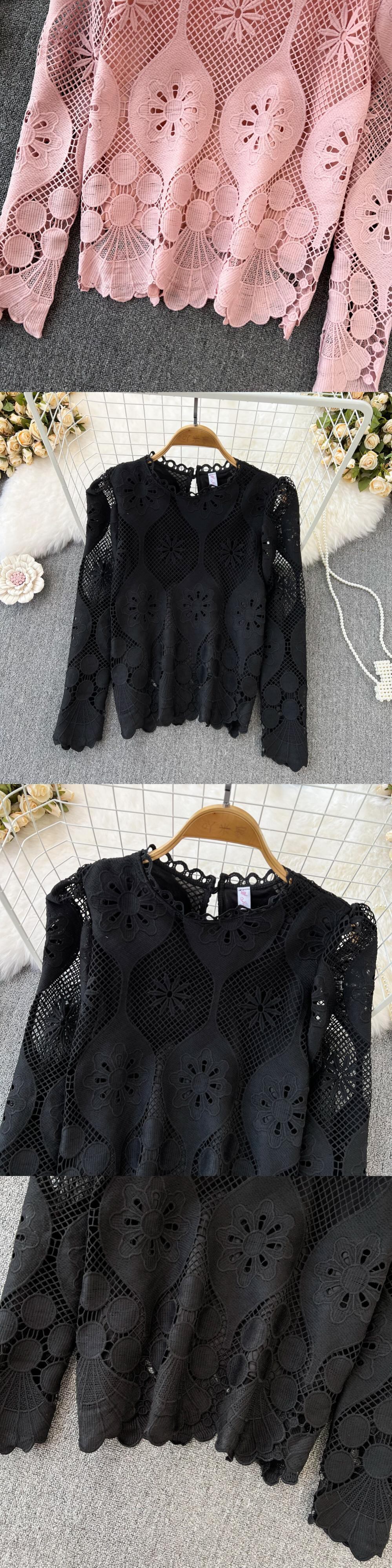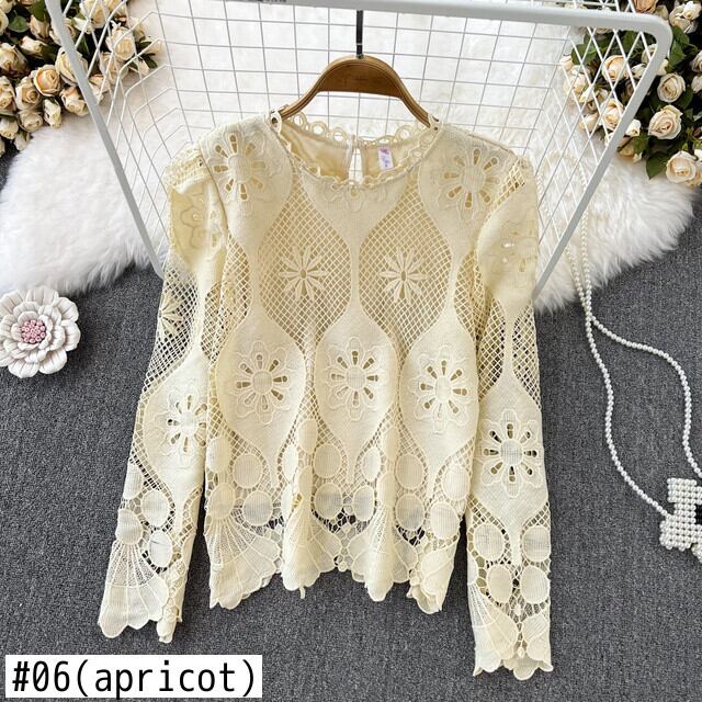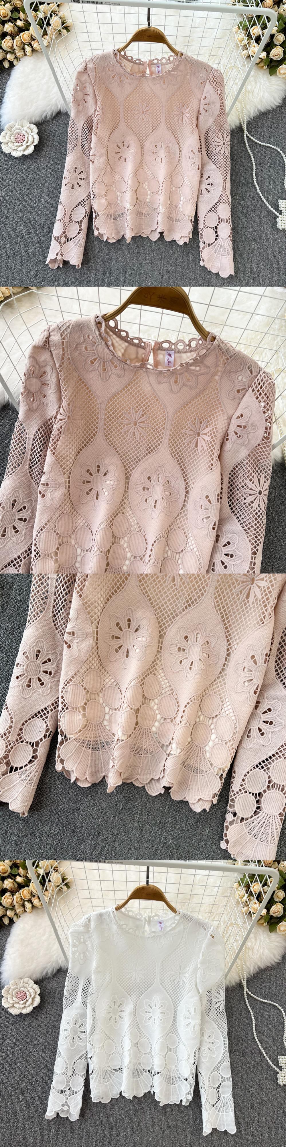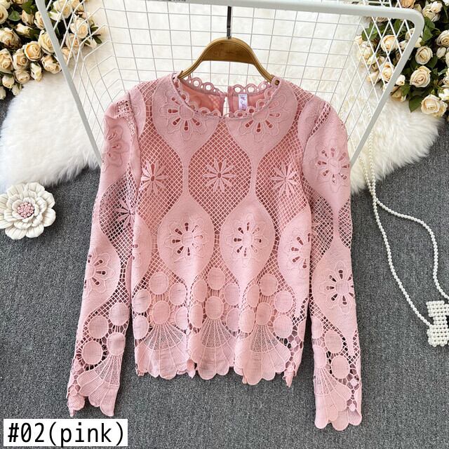 [EWQ] フックフラワー中空アウトシャツ長袖刺繍ピンク甘い夏潮因果トップ 16U16 ロング 大人ガーリー スウィート キュート カジュアル サマー 夏物 フラワーデザイン