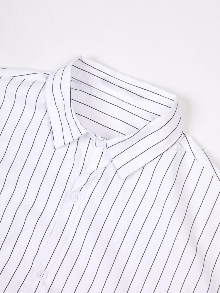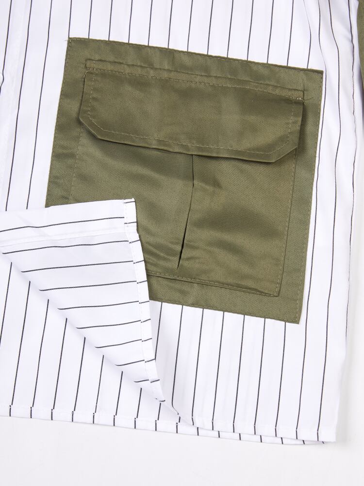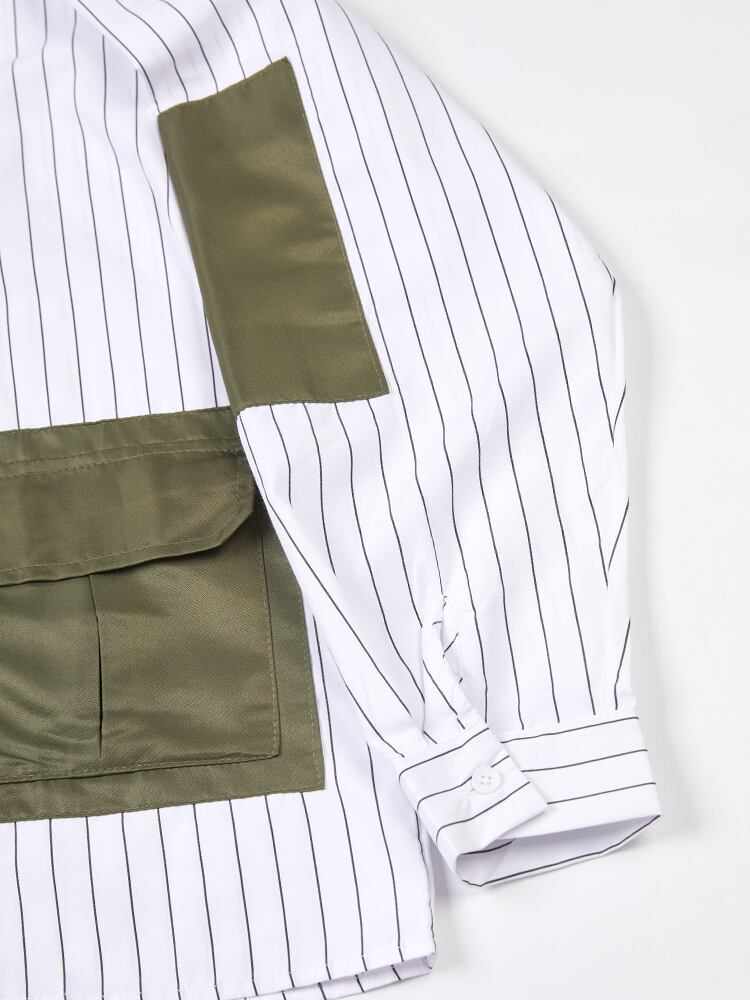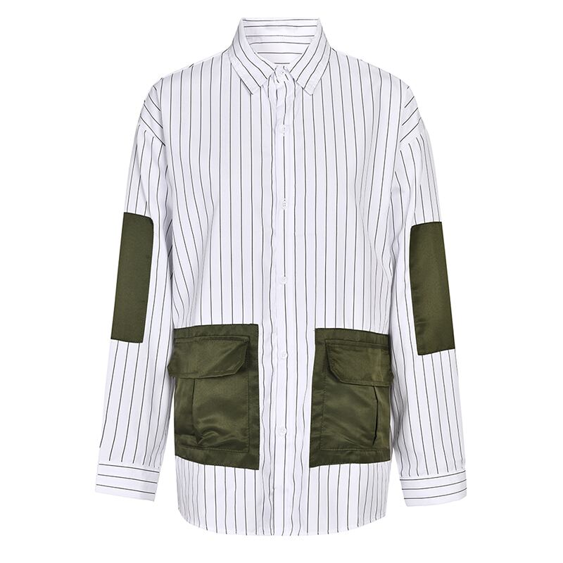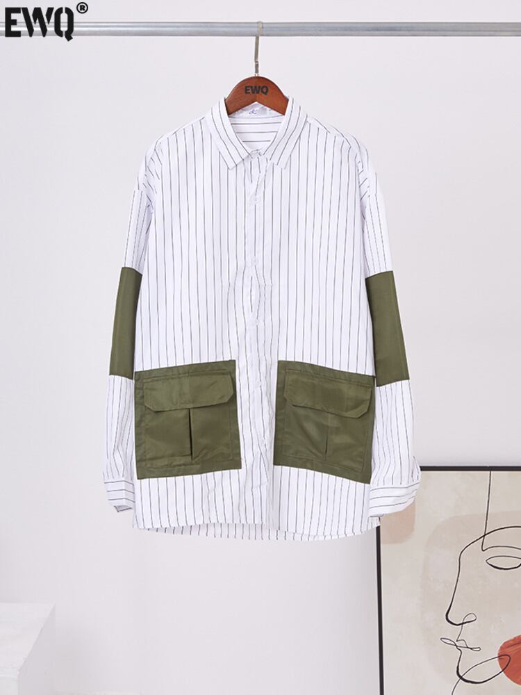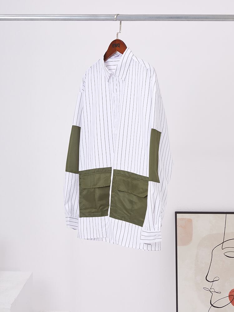 [EWQ] 長袖パッチワークポケットストライプビッグサイズシャツ対照的カラートップス秋夏白ブラウス ロング ホワイト サマー 夏物 オータム 秋物