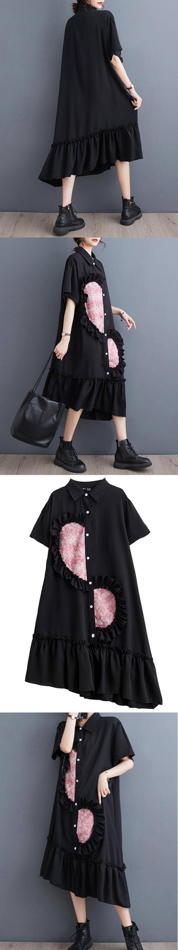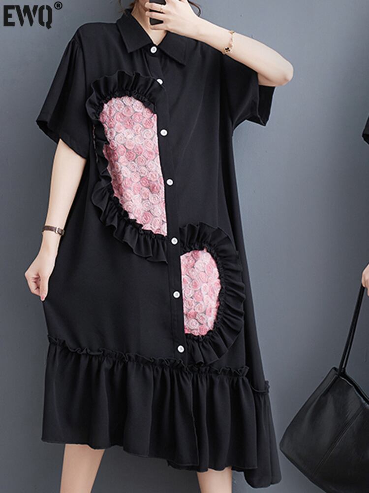[EWQ] 特大シャツドレス夏ルーズメッシュスプライスフラワーコントラストカラー半袖ドレス Vestido ショート ハーフスリーブ サマー 夏物 フラワーデザイン