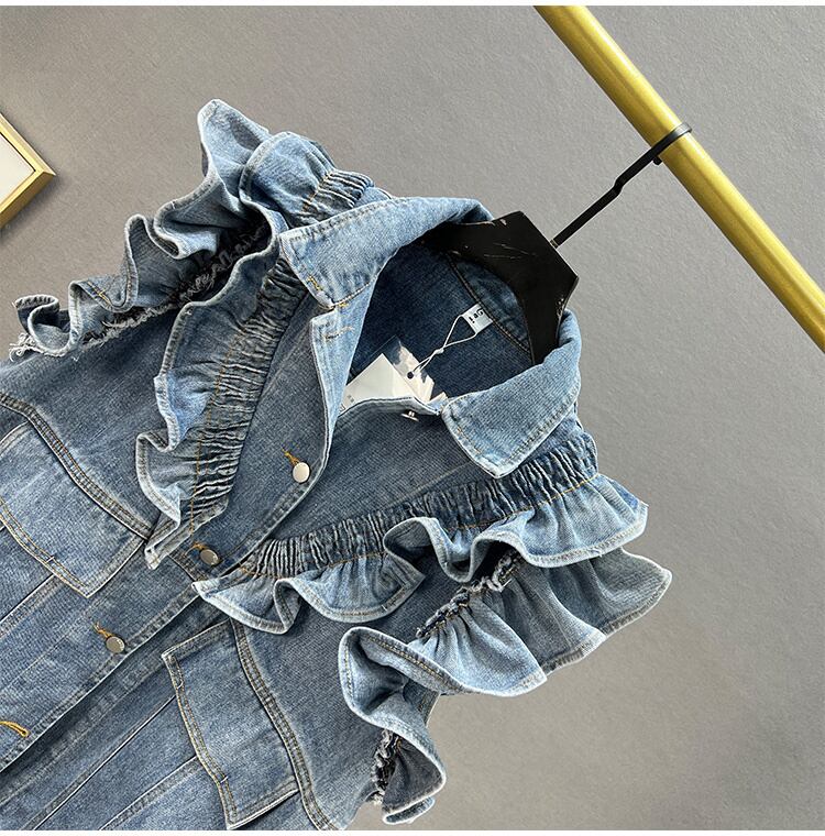 [EWQ] デニムベストフリルスプライシングストリートシングルブレストノースリーブジャケット夏潮チョッキ サマー 夏物