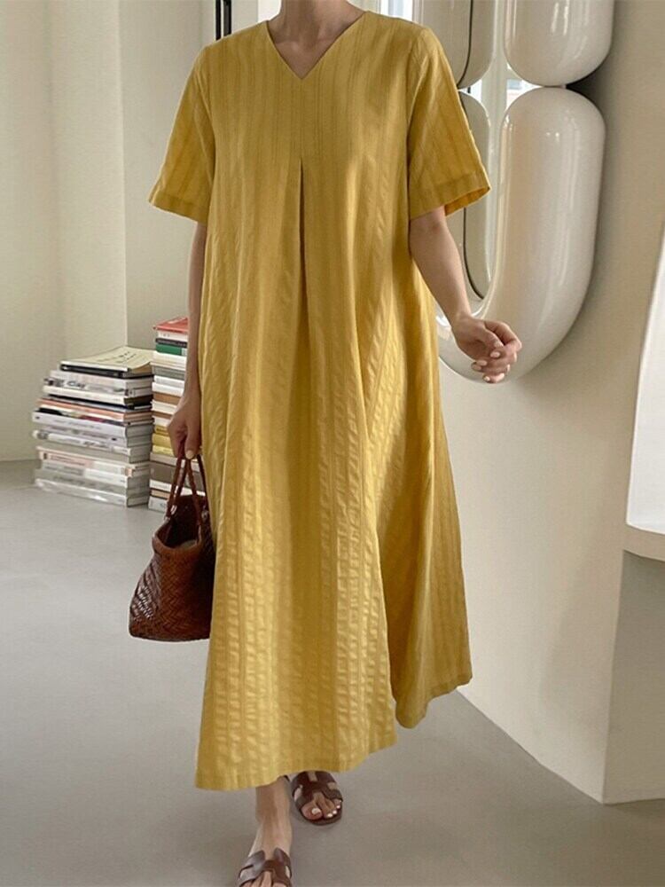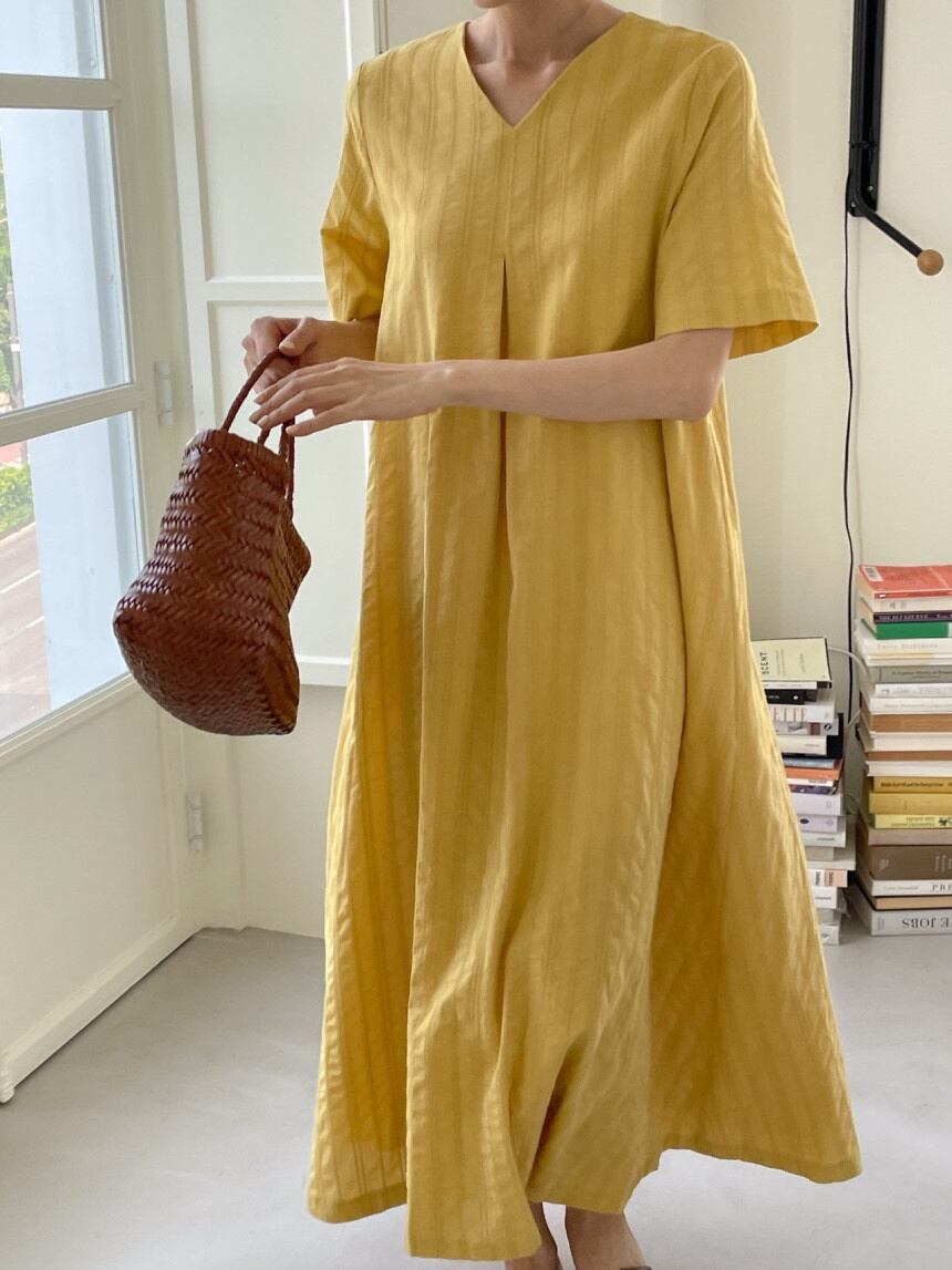 [EWQ] シンプル V ネックドレスルーズカジュアルイエロー半袖ドレス夏潮 Vestido 16U117 ショート ハーフスリーブ サマー 夏物 Vネック