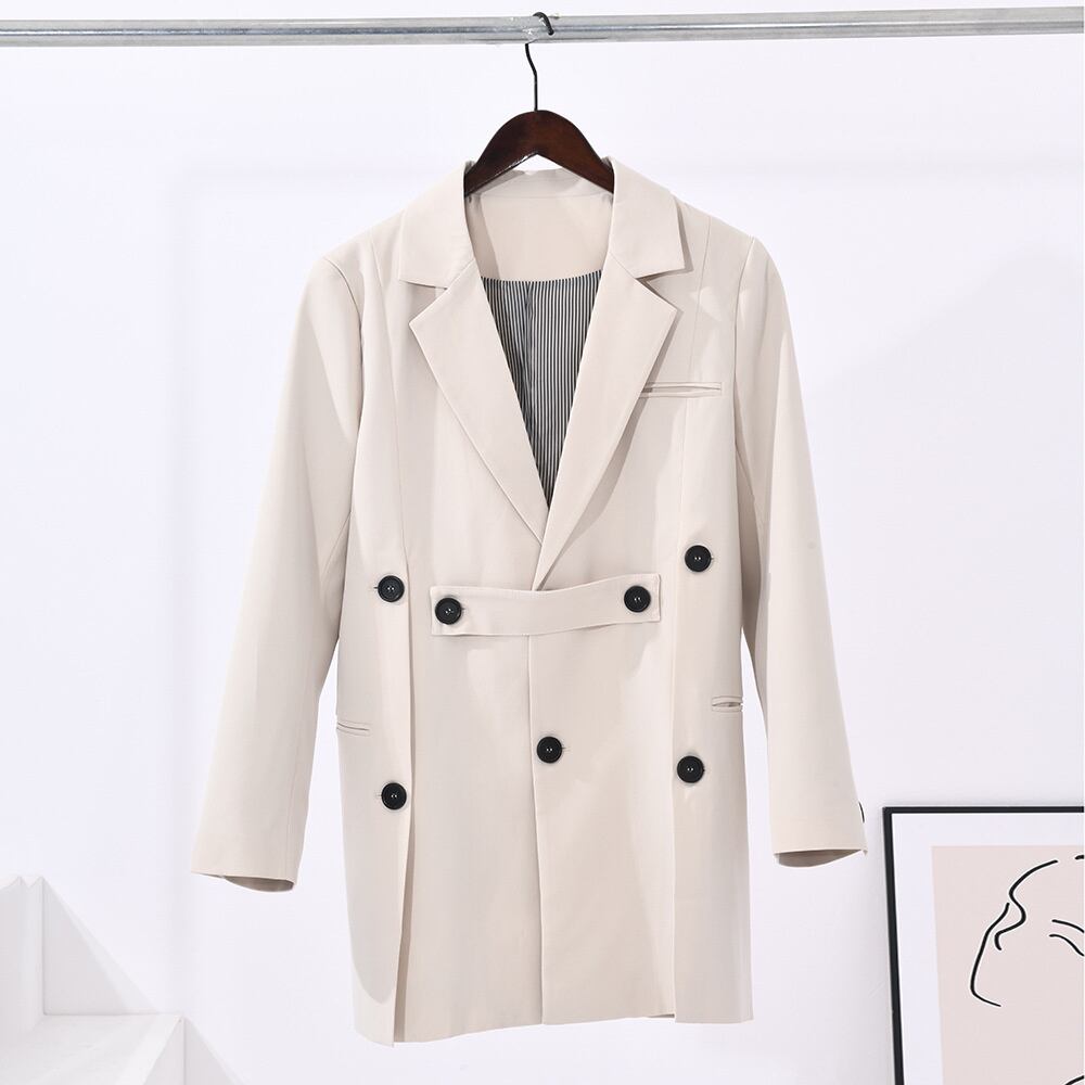 [EWQ] ルーズフィットボタンベージュブレザー気質スーツジャケットラペル長袖コート潮夏潮 ロング サマー 夏物